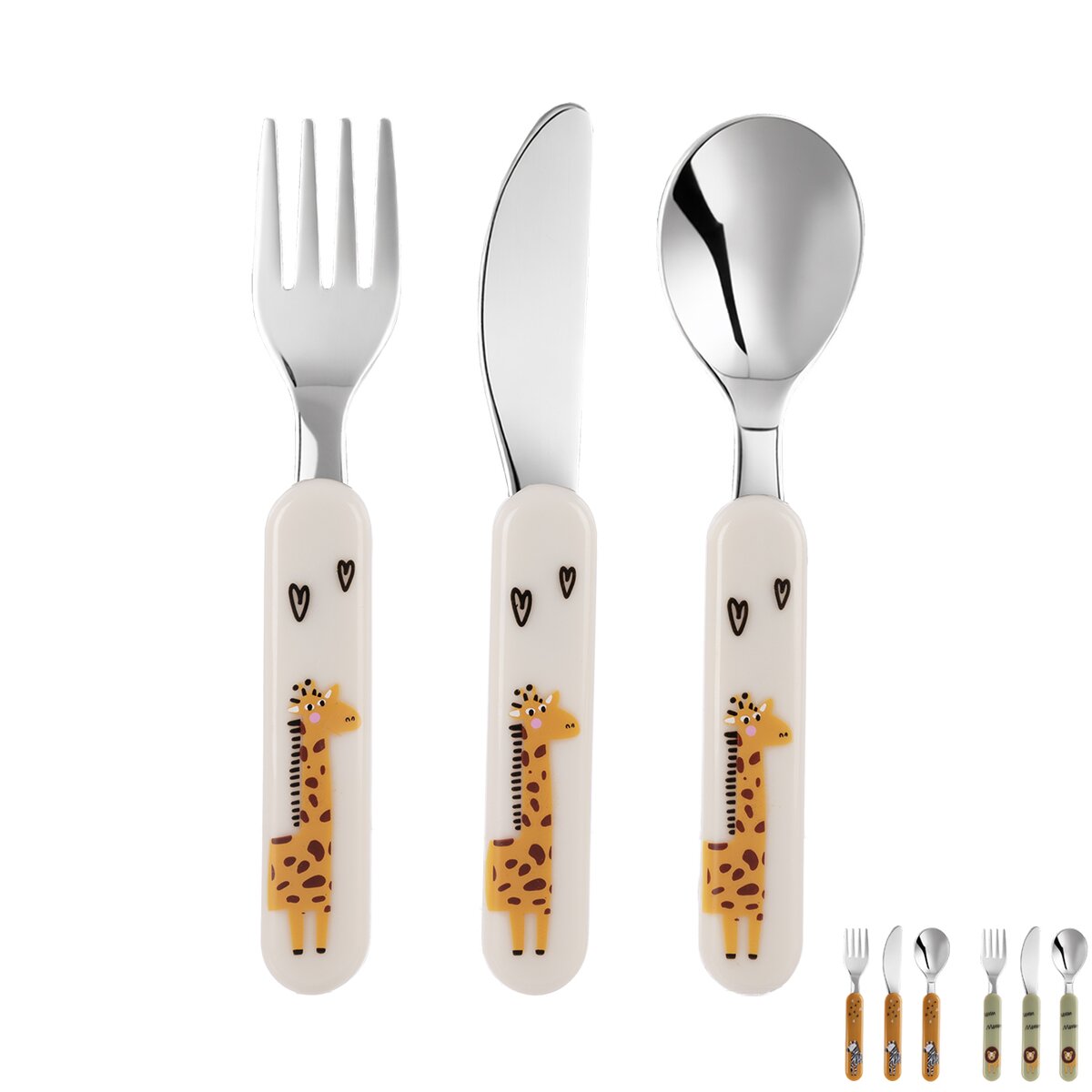 Kód produktu 154219Detský príborový set s veselým motívom zvieratiek na prvé stolovanie. Obsahuje lyžicu, vidličku a nôž. Materiál: nerezová oceľ, plast PS. Tvar prispôsobený detským rukám na jednoduché a bezpečné používanie. Možno umývať v umývačke riadu. Rozmery: (dĺžka/šírka) lyžica 14/3,5 cm, vidlička 13,5/2,5 cm, nôž 14/2 cm.