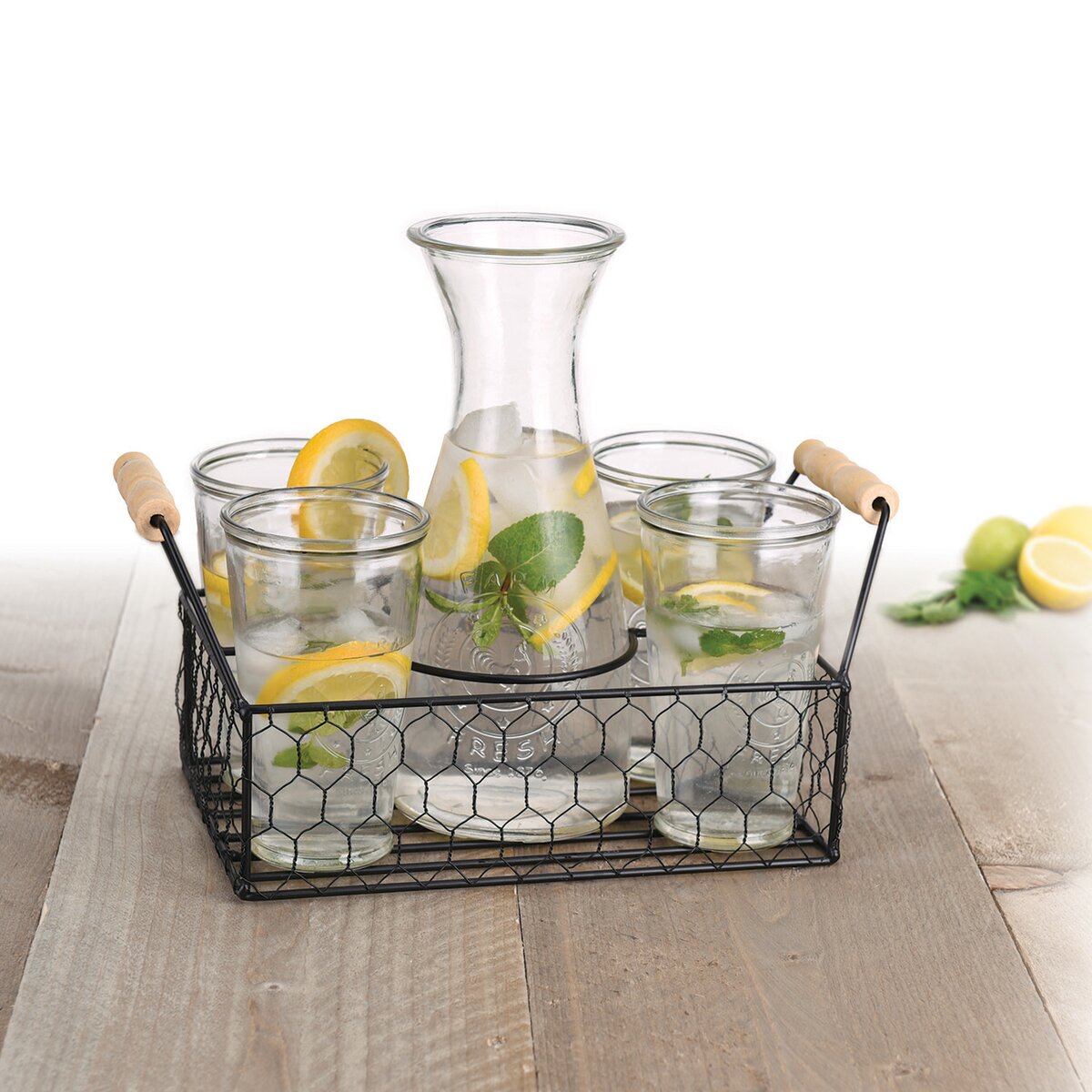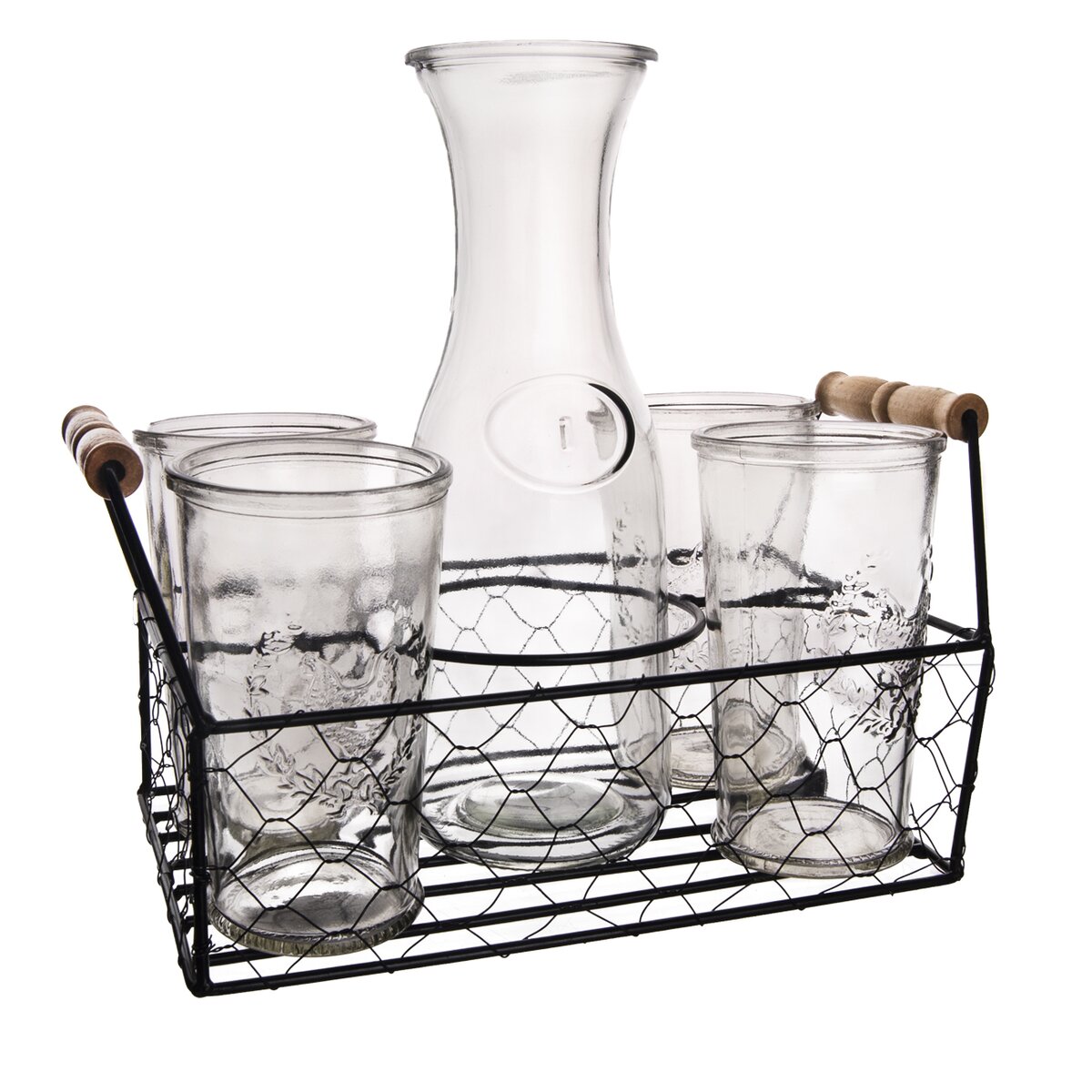 Sada karafy a pohárov v stojane s uchami sa skvele hodí pre servírovanie osviežujúcich nápojov na terasu, záhradu i doma. Materiál: sklo, kov, drevo. Rozmery: karafa 1 l, pr. 10,5 cm, v. 25,5 cm, poháre pr. 8 cm, v. 14,5 cm, stojan 25x17 cm.