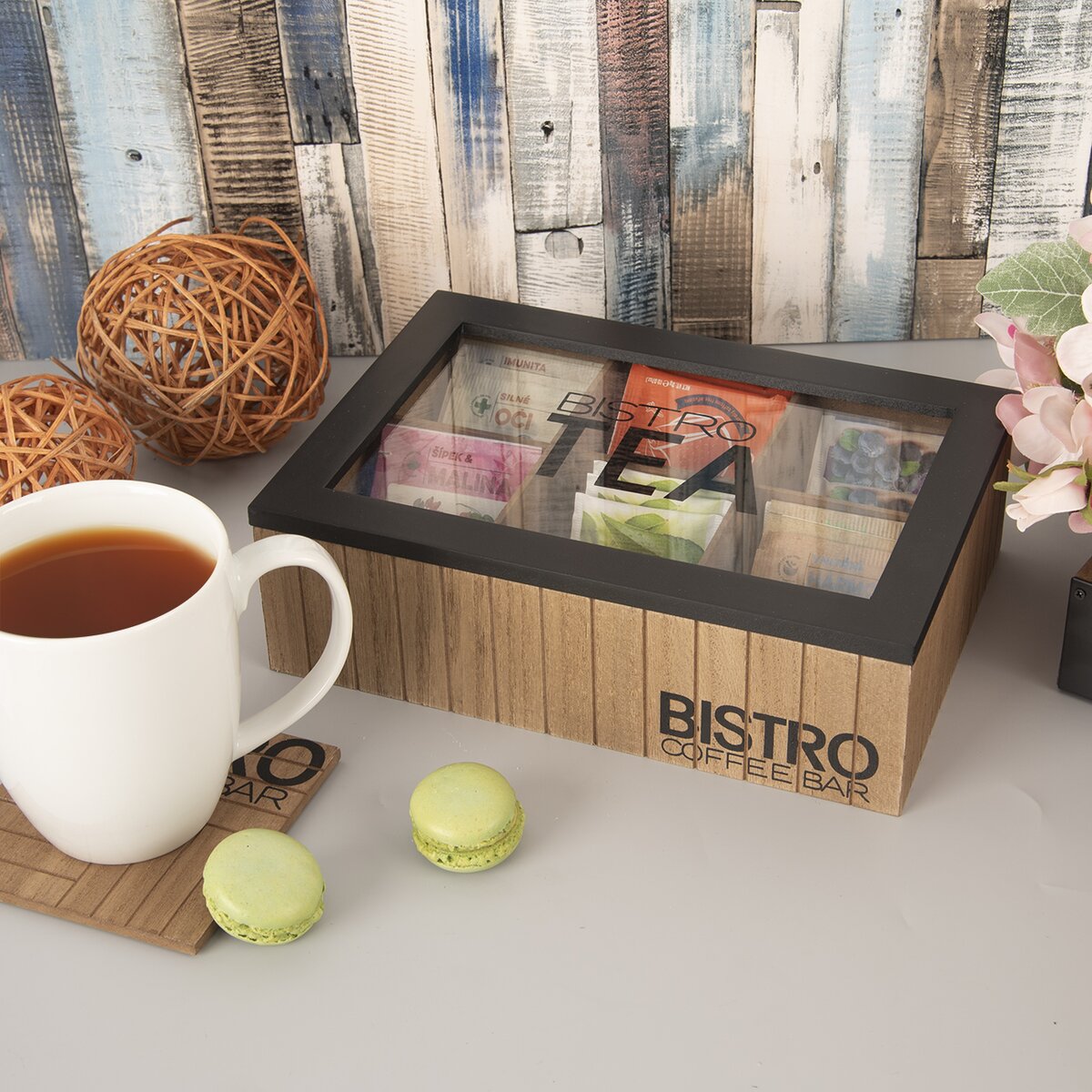 Kód produktu 127183Štýlová kazeta BISTRO na čajové vrecká je rozdelená do 6 sekcií, je vyrobená z drevovláknitej dosky a uzavretá bukovým vekom so sklenenou výplňou.