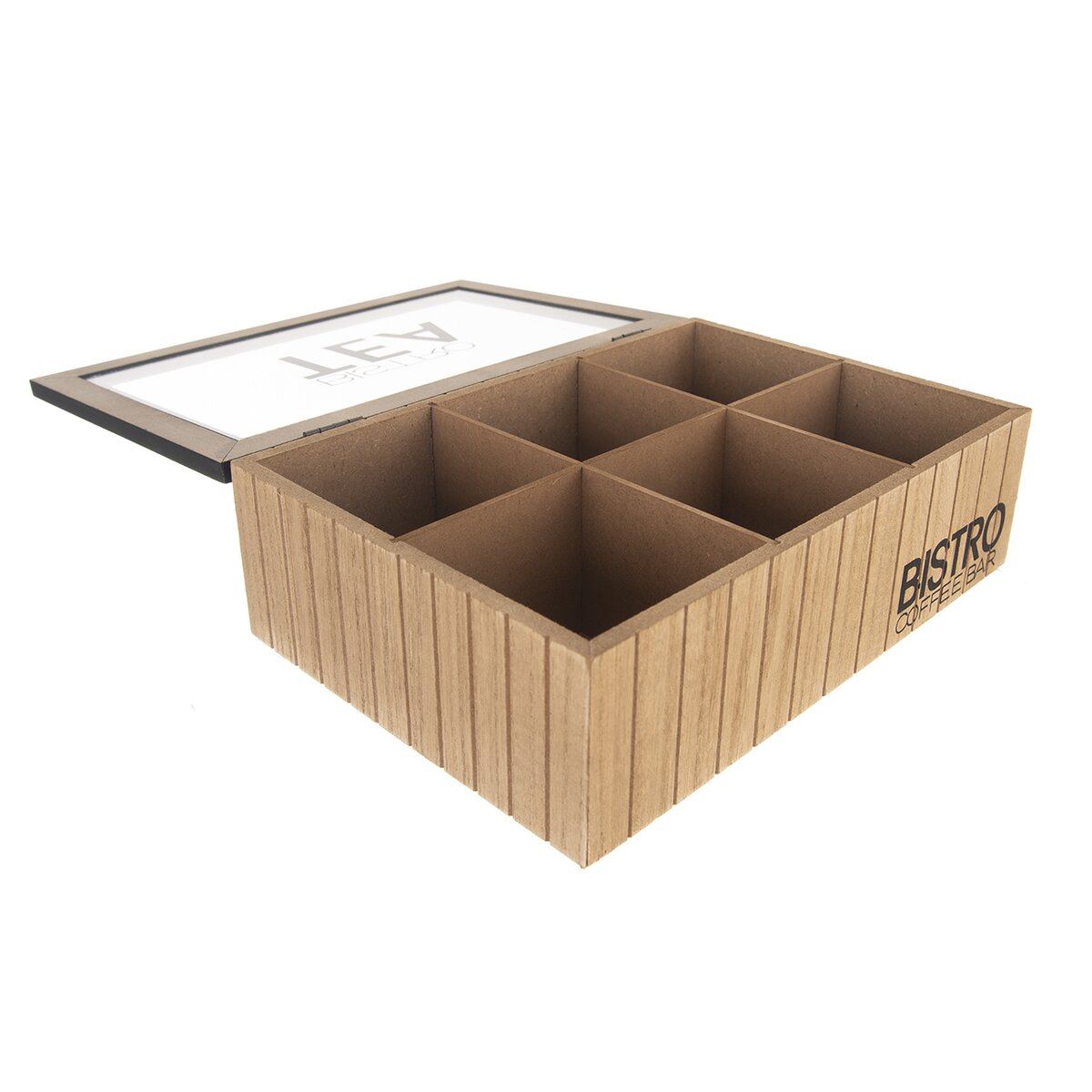 Kazeta vo veľkosti 24x16,5x7,3 cm je rozdelená na 6 sekcií, takže aj vašim hosťom, kolegom v práci alebo klientom môžete štýlovo ponúknuť čaj, ktorý majú radi.