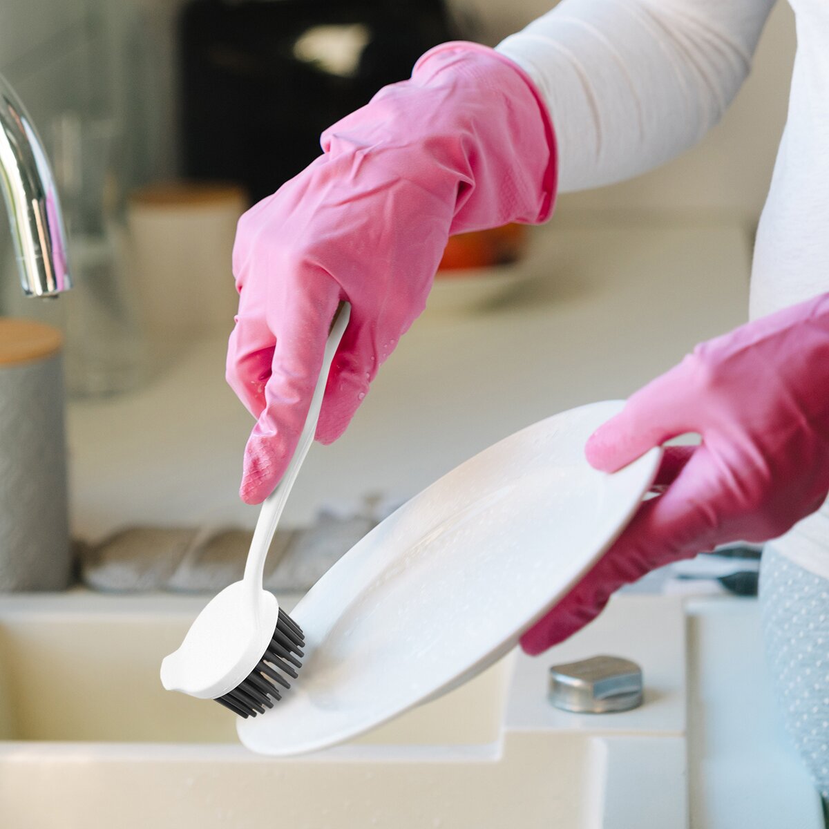 Zvlášť pokiaľ nemáte radi, keď sú vaše ruky od umývania riadu úplne vysušené, bude kefa s dlhou rukoväťou tou správnou voľbou. Vďaka otvoru v rukoväti je možné kefu zavesiť alebo ju opatriť špagátom, za ktorý ju možno pod drezom zavesiť na háčik. Možno ju použiť aj na čistenie kúpeľne, kuchynského kúta a pod.