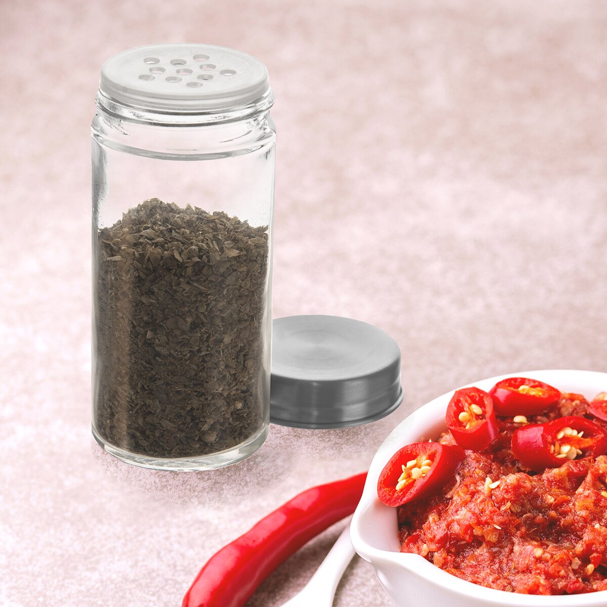 Sklenená korenička uľahčí vďaka priehľadnému telu identifikáciu korenia, byliniek či soli, prípadne ju možno polepiť samolepkou z našej ponuky a popísať. Pod plastovým viečkom so závitom je sypátko, takže umožní dávkovať jemné druhy korenia, alebo ju možno odňať a vložiť napr. klinček, bobkový list alebo škoricu.