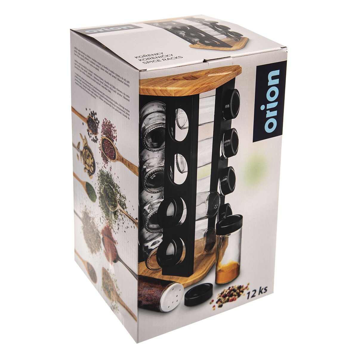 Viac informáciíDizajnový otočný drevený stojan na trojuholníkovej základni v rozmere 18x18x18 cm s čiernymi nerezovými lištami s otvormi, ktorého súčasťou je 12 kusov sklenených koreničiek priemerom 4,5 cm a výšky 10 cm. Každá má plastové sypátko a čierne viečko z PE. Podľa vloženého korenia alebo dochucovadla tak môžete sypátko ponechať alebo ho dáte dole a pohodlne nasypete a vysypete väčšie kúsky, napr. nové korenie, klinčeky.