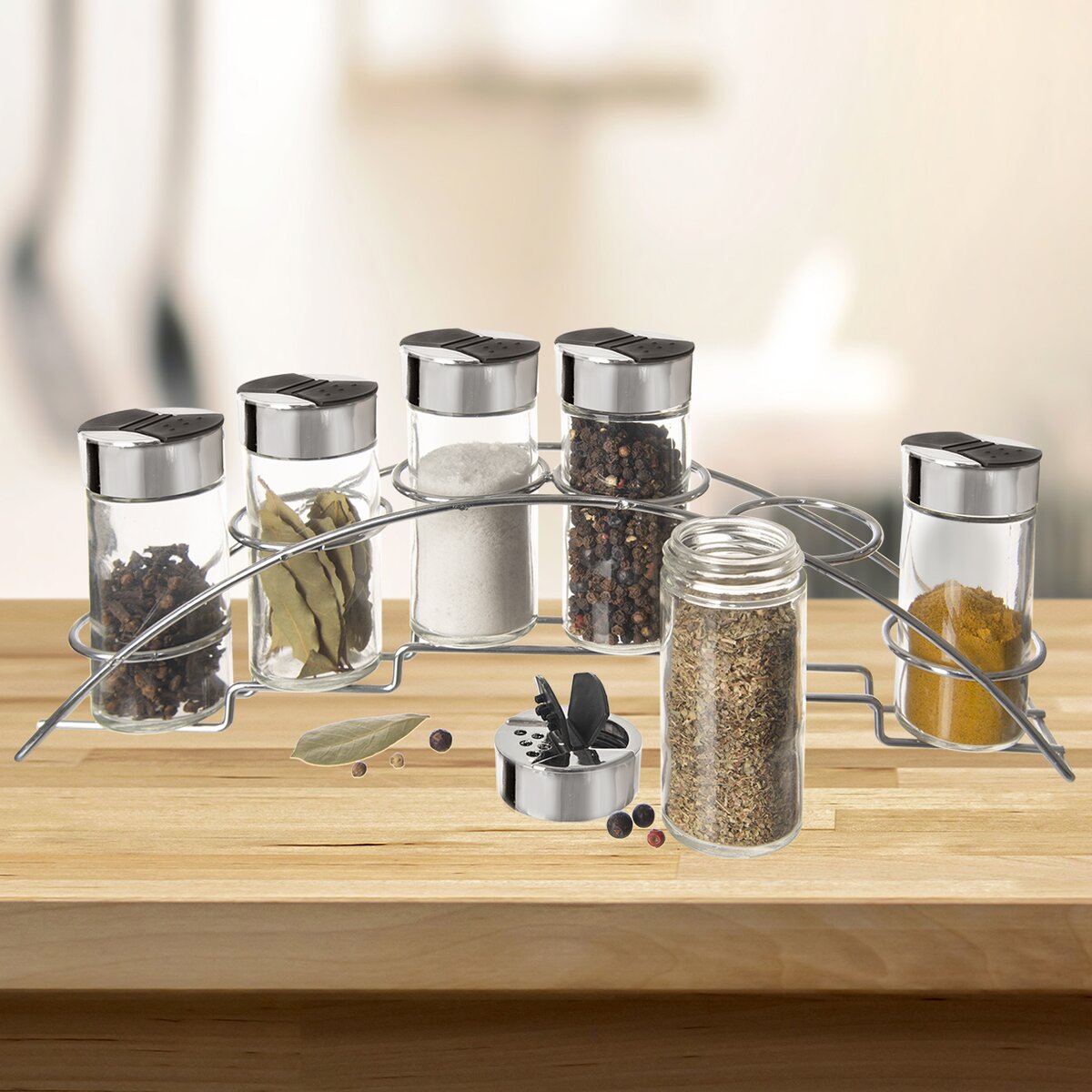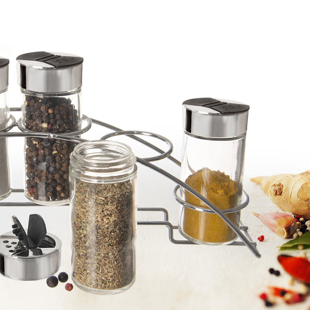 Viac informáciíDizajnovým a zároveň praktickým pomocníkom je chrómovaný stojan so 6 koreničkami s objemom 100 ml. Prehľadne uloží základné druhy korenia a urýchli tak prípravu pokrmov.