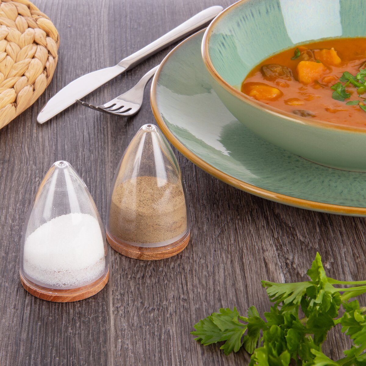 Viac informáciíPraktická dvojica priehľadných koreničiek z PS plastu zaistí, že budete mať korenie a soľ na stole vždy po ruke. Sú umiestnené na základni z bukového dreva, ktoré sú doplnené silikónovým tesnením, čím sa uchová vložené korenie v suchu a nedôjde k jeho vysypaniu širšou stranou. Korenie či soľ jednoducho nasypete do pripravovaného pokrmu alebo dochutíte naservírované pokrmy priamo na stole vďaka malému otvoru v špičke týchto kónických koreničiek.