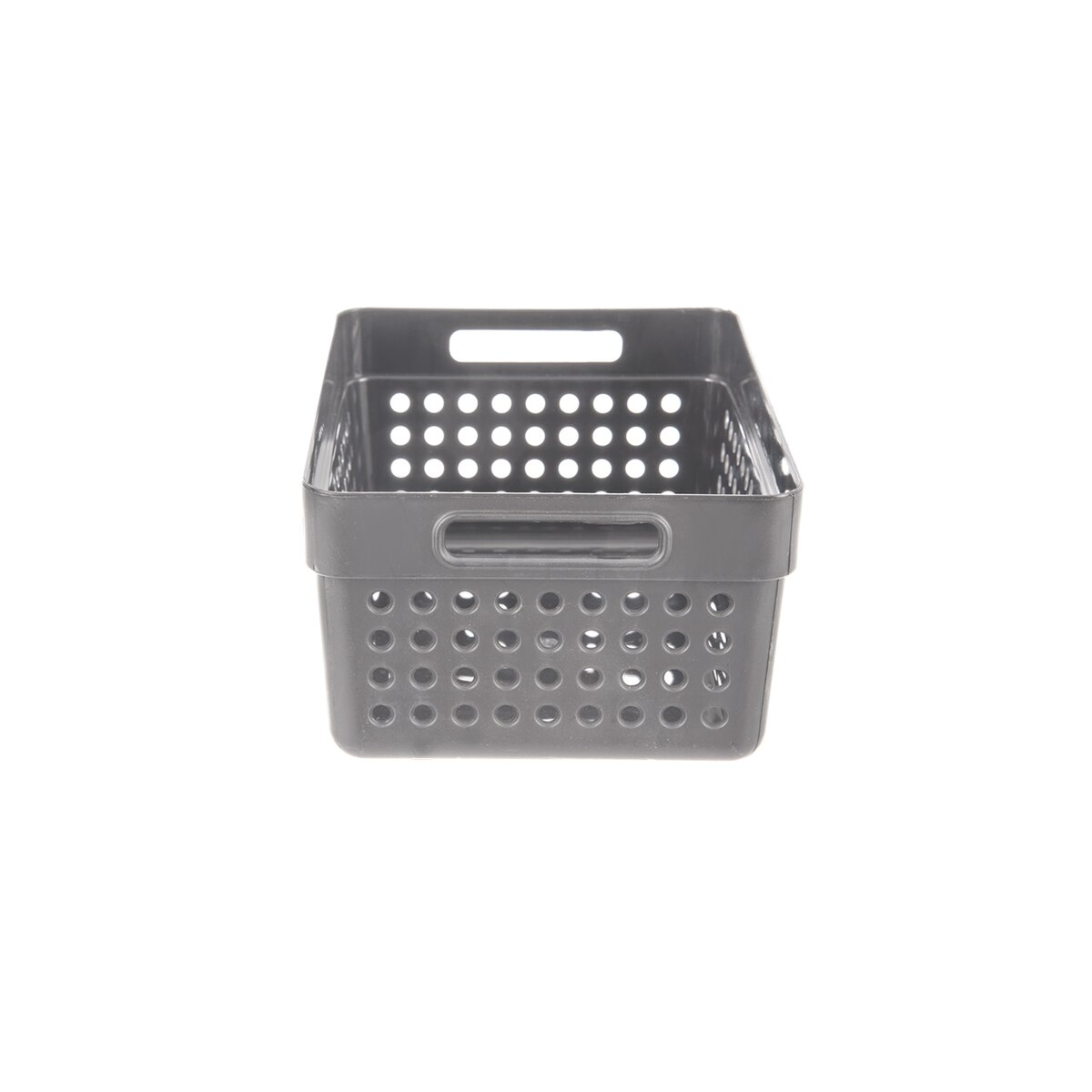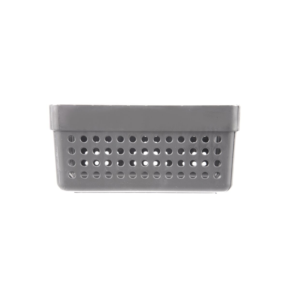 Kód produktu 731641Plastový malý košík v šedej farbe má veľkosť 15,5x11,5x7,3 cm a hodí sa na uloženie koreničiek, kancelárskych potrieb i drobnej kozmetiky.