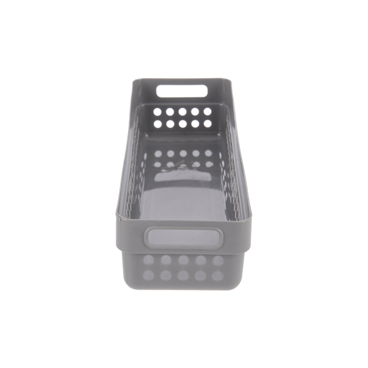 Kód produktu 731639Plastový podlhovastý košík v šedej farbe má veľkosť 23,5x7,5x5 cm a hodí sa na uloženie koreničiek, príborov, písacích potrieb i drobnej kozmetiky.