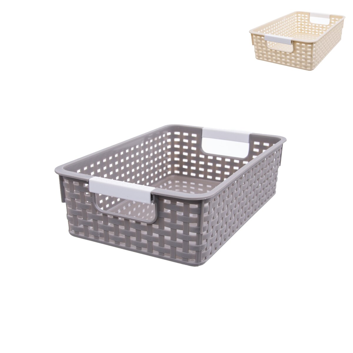 Košík s ušami na uloženie rôznych drobností kdekoľvek v domácnosti. Materiál: plast. Farebný assort. Rozmery: 30,5x21x8 cm.