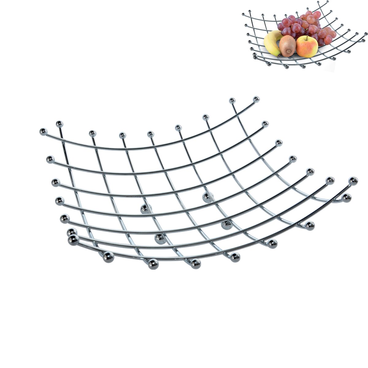 Košík na ovocie v modernom prevedení sa hodí do každej kuchyne. Materiál: pochromovaný drôt. Rozmery: 28x28x9 cm.