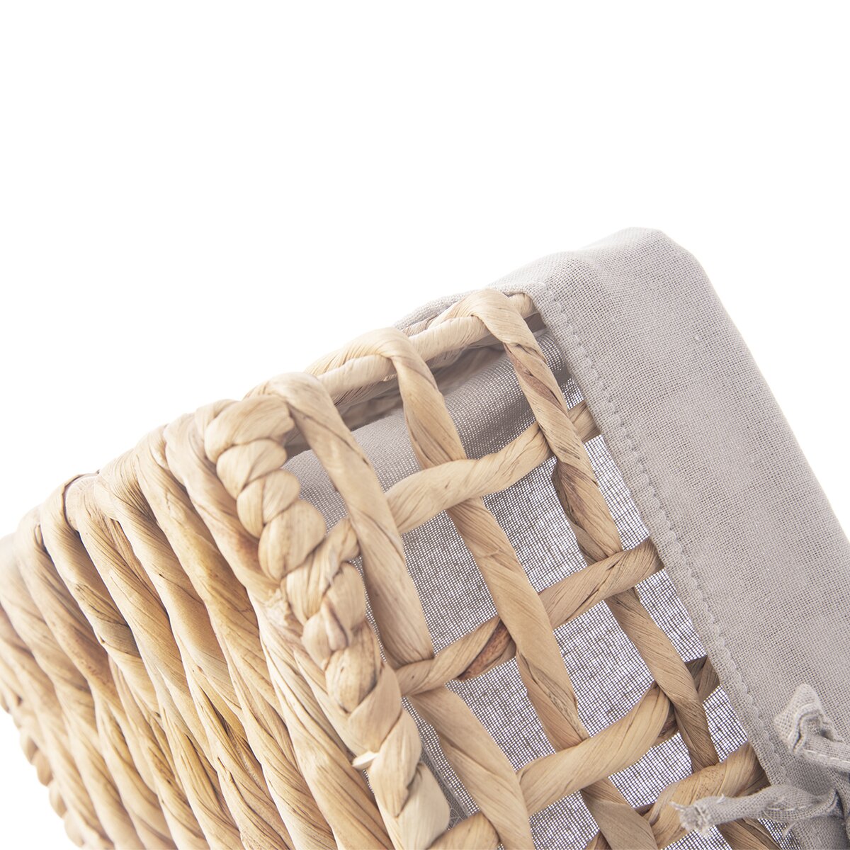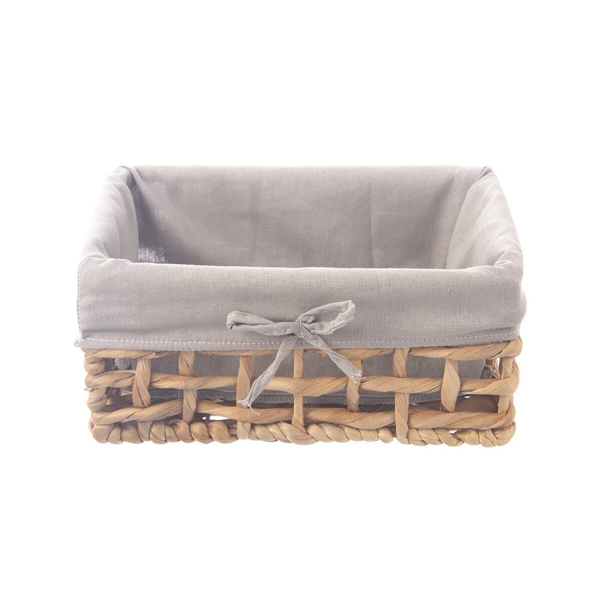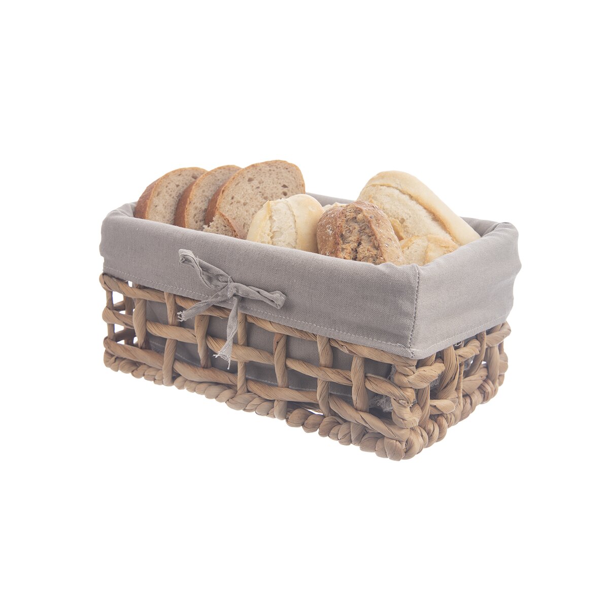 Hranatý košík s rozmerom 27x17x13 cm z vodného hyacintu je doplnený bavlnenou šedou vložkou. Vhodný na ukladanie a servírovanie pečiva aj na uloženie rôznych drobností nielen v domácnosti.