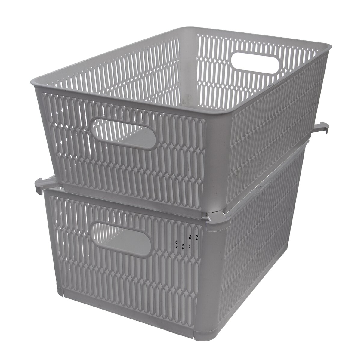 Šedý nižší košík NESTA má navyše vychytávku v podobe vysúvacích klapiek v dolnej časti, z rohov možno klapky vysunúť a uložiť tak niekoľko košíkov na seba.