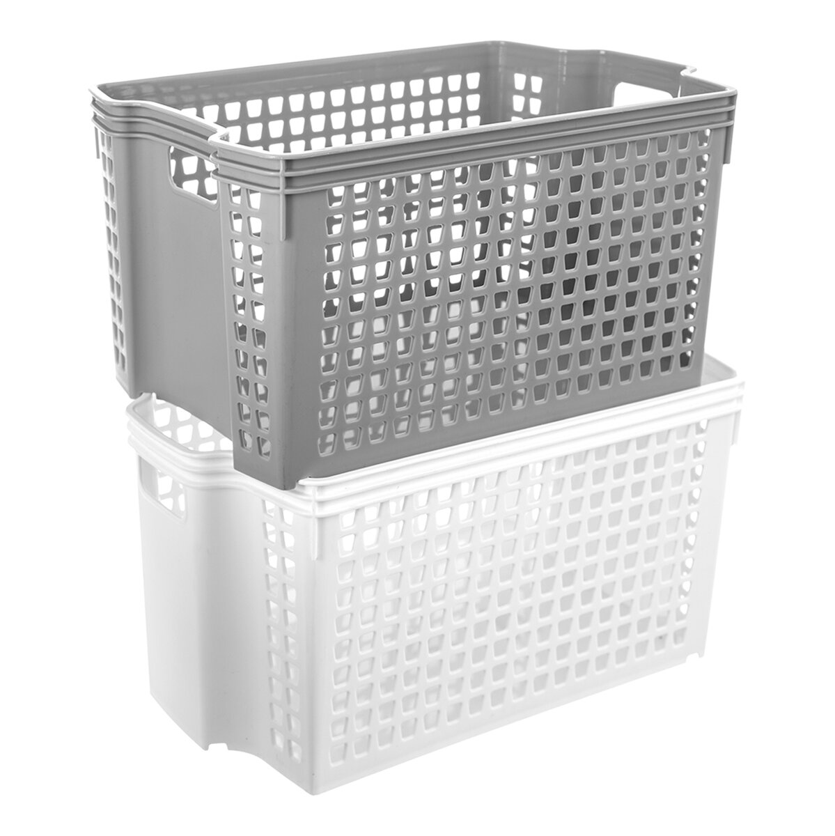 Jeho prenášanie uľahčujú dva úchyty. Košíky sú stohovateľné, vďaka čomu ušetríte miesto v poličkách alebo v skriniach. Vyrába sa v bielom alebo šedom prevedení.