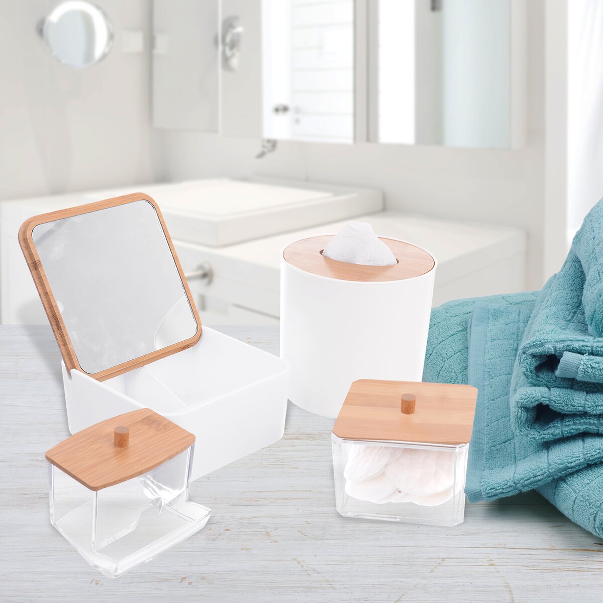 Kód produktu 731330Odpadkový kozmetický kôš je vyrobený z plastu a je možné ho uzavrieť bambusovým viečkom.