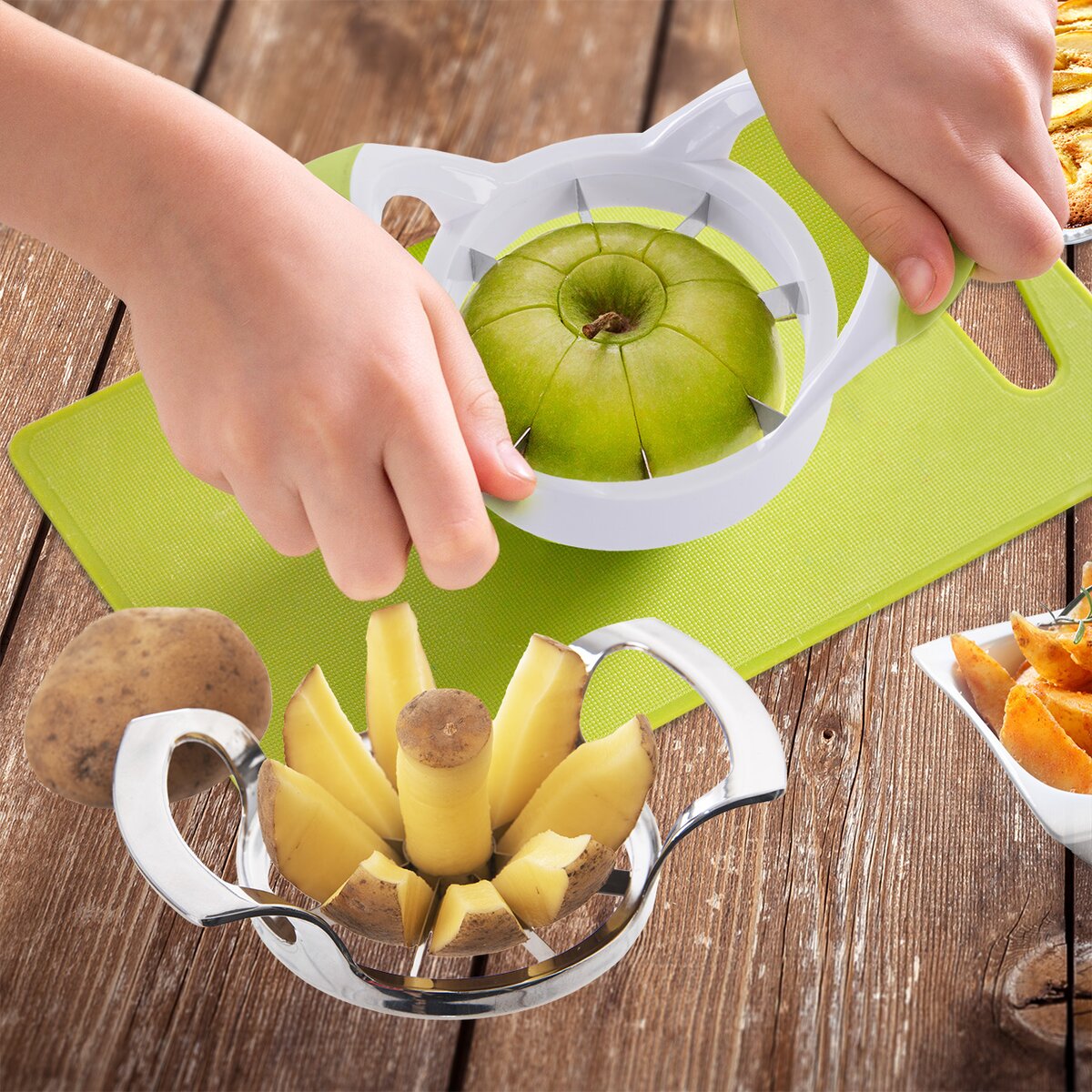Kovový krájač na jablká jednoduchým zatlačením na rukoväti oddelí jadrovník a jablko naporcuje na osminky. Do jablkového koláča, ovocných tvarohových knedlí, na zahryznutie na výlete, na desiatu do krabíc a pod.
