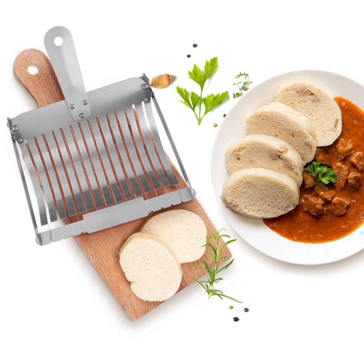 Kód produktu 130429Nerezový krájač na práve uvarené žemľové alebo zemiakové knedle nakrája vďaka systému napnutých strún až 15 rovnomerných plátkov. Možno umývať v umývačke riadu.