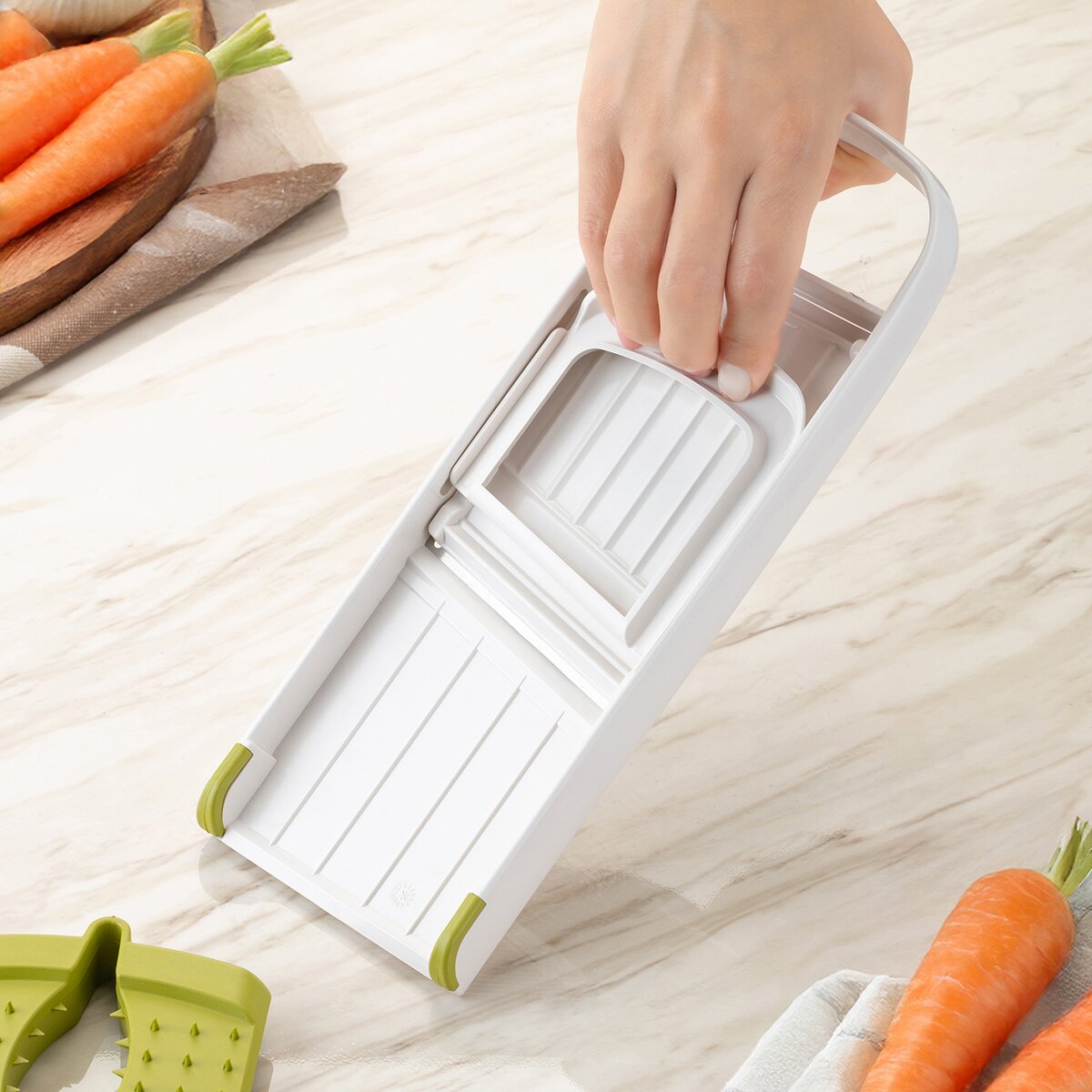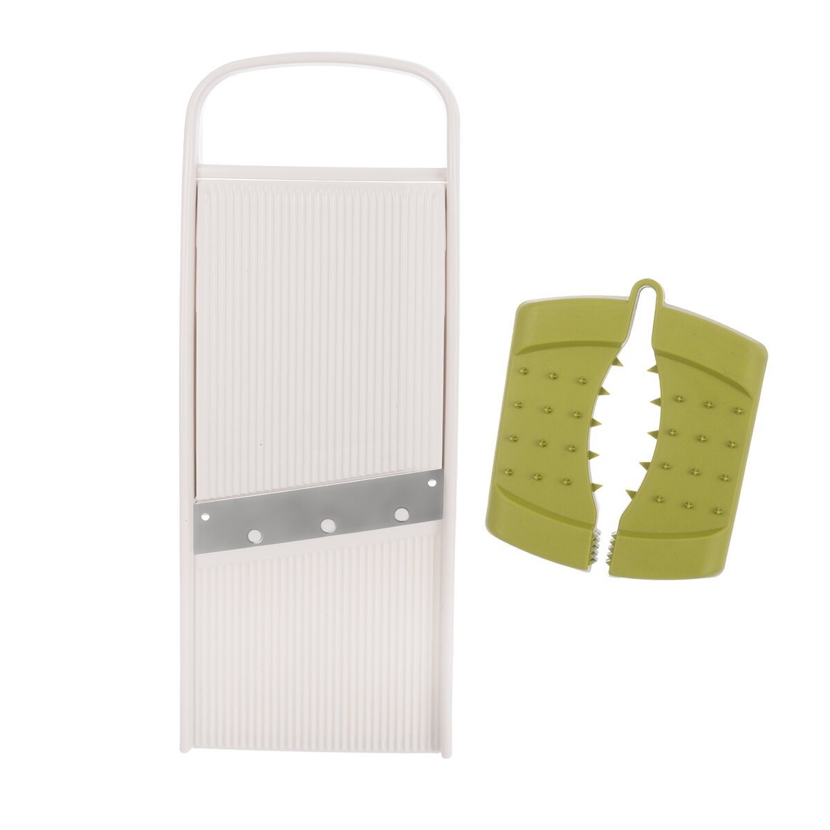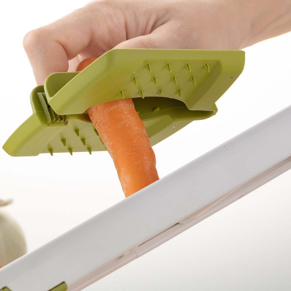 Kód produktu 144716Krájač-strúhadlo s vodiacim držiakom je praktickým pomocníkom pre rýchle a bezpečné krájanie a strúhanie potravín. Umožňuje nastavenie hrúbky plátkov v troch stupňoch – 3, 5 a 7 mm – podľa potreby a typu suroviny. Krájač je vybavený držiakom proti poraneniu so špeciálnymi hrotmi, ktoré zaisťujú pevné uchytenie potravín počas práce a umožňujú bezpečnú manipuláciu aj s malými surovinami, napríklad cesnakom. Pre väčšiu stabilitu pri použití obsahuje prístroj dva protišmykové rohy, ktoré zabraňujú nežiaducemu posunu krájača počas krájania či strúhania, a zaisťujú tak pohodlnú a bezpečnú prácu v kuchyni. Výrobok je BPA-free. Materiál: plast ABS + plast PP (držiak) + nerezová oceľ 301 + EVA (anti slip rohy). Rozmery: 28x10,5x4 cm. Možno umývať v umývačke.