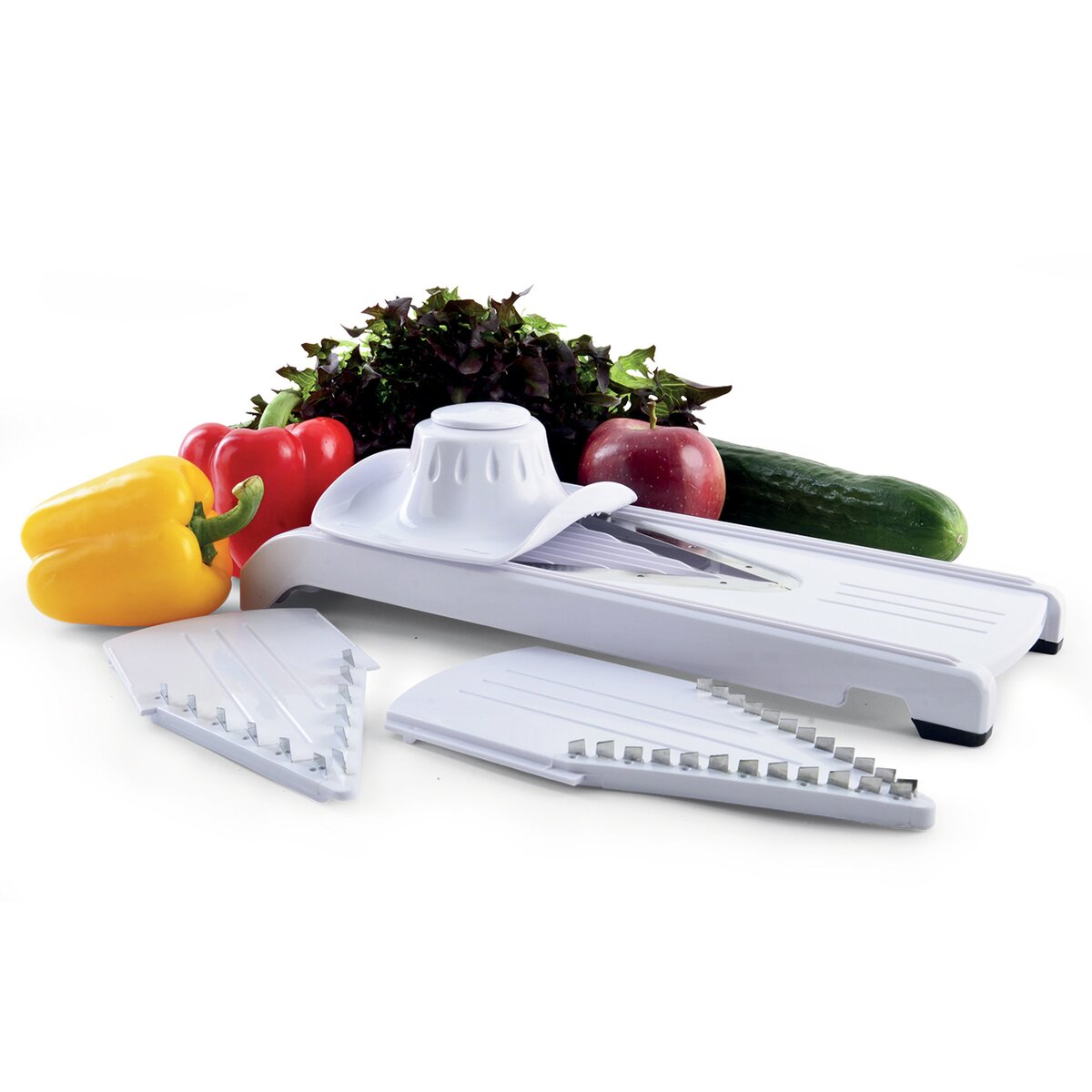 Kód produktu 130485Viacúčelový krájač zeleniny a ovocia s výmennými strúhadlami pre strúhanie úzkych aj širších kusov zeleniny a plátkov. Obsahuje aj vodiacu rukoväť pre ochranu prstov.