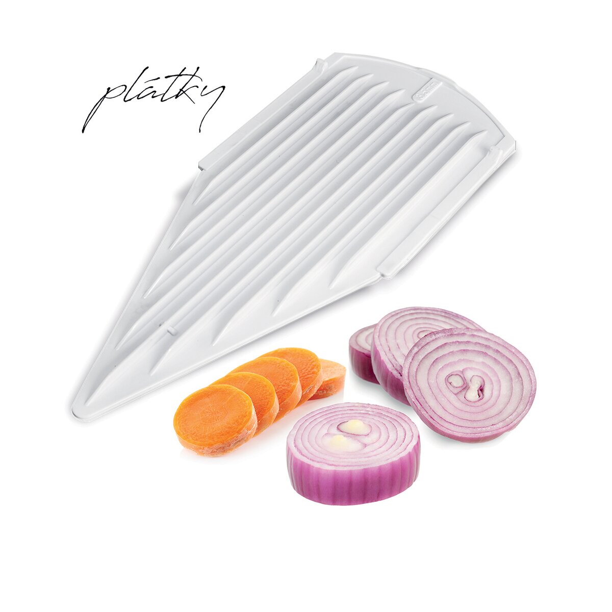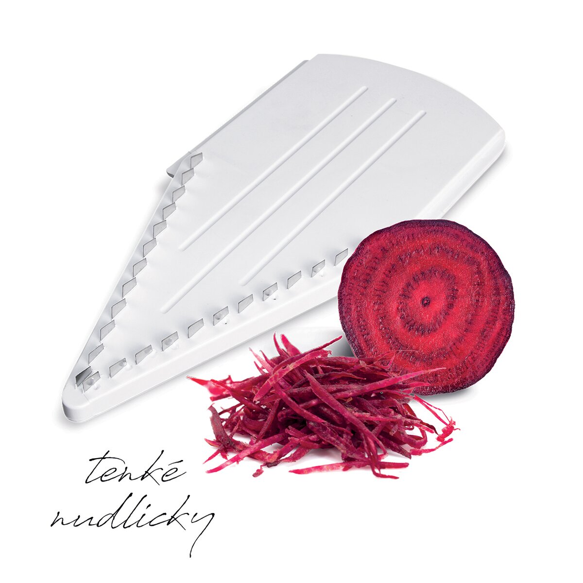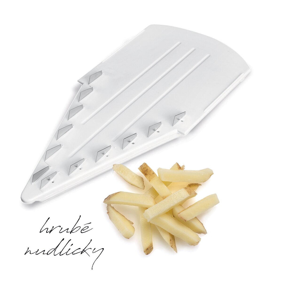 Viac informáciíNa prípravu domácich hranolčekov zo zemiakov, zeleru, sladkých zemiakov, pri strúhaní zeleniny do šalátu, k pečenému mäsu a do polievky možno využiť šikovný krájač, viacúčelové strúhadlo zeleniny a ovocia.