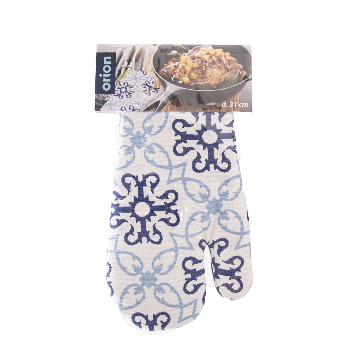 Kód produktu 152181Bavlnená kuchynská rukavica s modrými ornamentmi a pútkom na zavesenie.