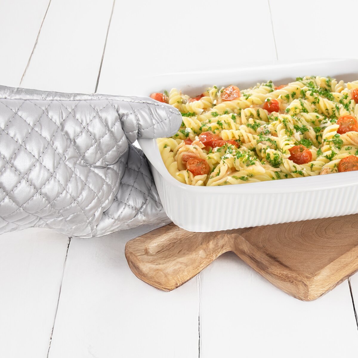 Kód produktu 153930Kuchynská chňapka je ochranná rukavica určená pre bezpečné použitie v domácnosti, najmä pri varení, pečení, manipulácii s riadom v rúre, na grile alebo na platni. Chráni ruku pred tepelnými rizikami spojenými s vybratím či pridržaním horúcich predmetov a riadu, a to vďaka odolnosti proti kontaktnému teplu do 250 °C (maximálne po dobu 15 sekúnd). Chňapka patrí do triedy ochrany 2 a nie je vhodná na kontakt s priamym plameňom. V prípade potreby ju možno očistiť iba navlhčenou hubkou alebo handričkou. Nesmie sa prať, chemicky čistiť, bieliť, žehliť ani sušiť v sušičke. Vlhkú chňapku nenechávajte schnúť priamo na tepelnom zdroji. Pre ľahké skladovanie je možné ju zavesiť za pútko. Materiál: vrchný materiál bavlna, nástrek polyetylakrylát, výplň: bavlna, polyester, viskóza, podšívka: 100% polyester. Rozmery: 30,5x18 cm.