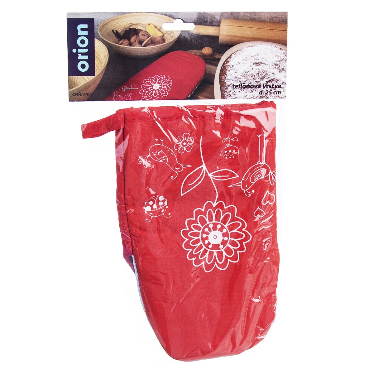 Kód produktu 152163Červená kuchynská chňapka so vzorom kvetov, magnetom a teflónovou úpravou.