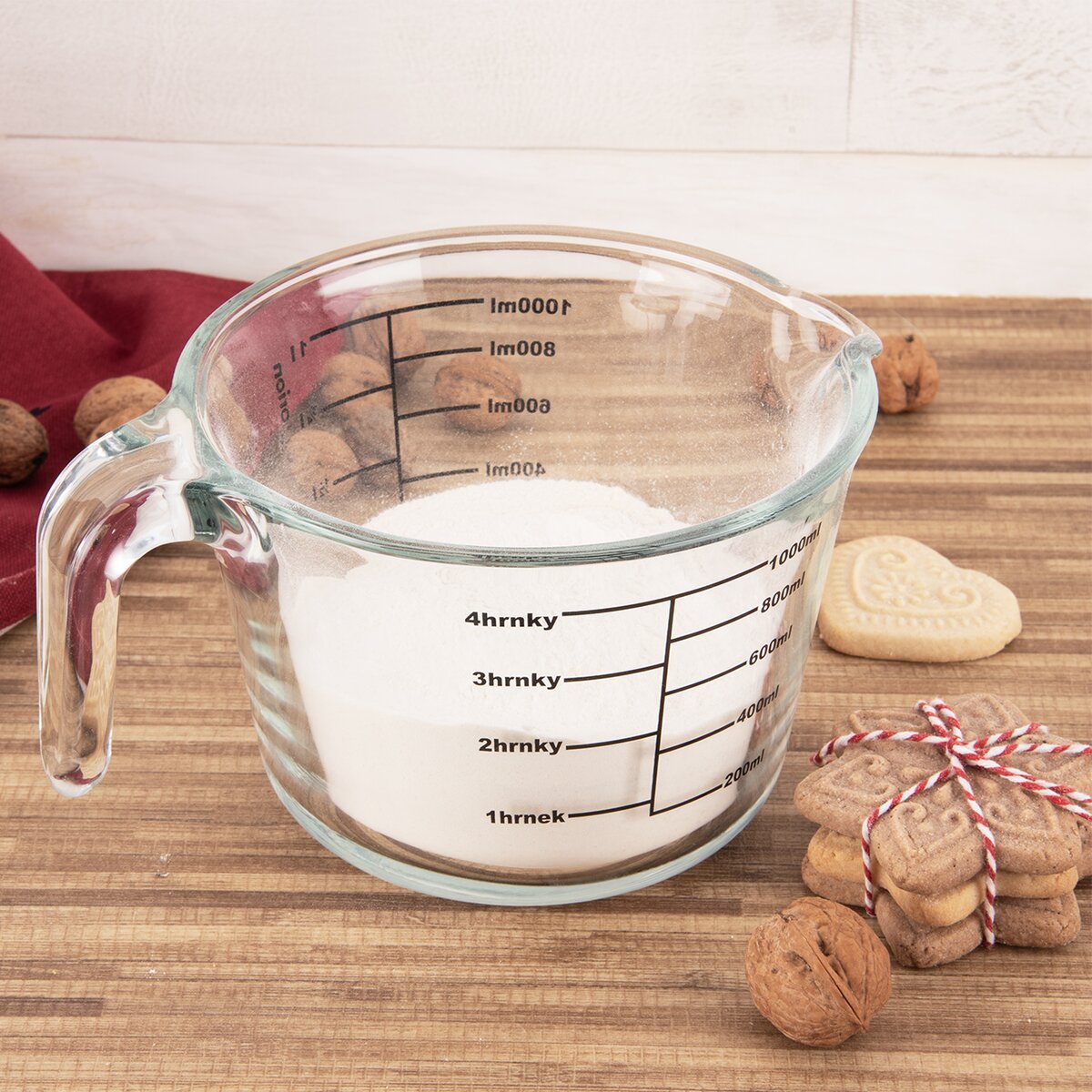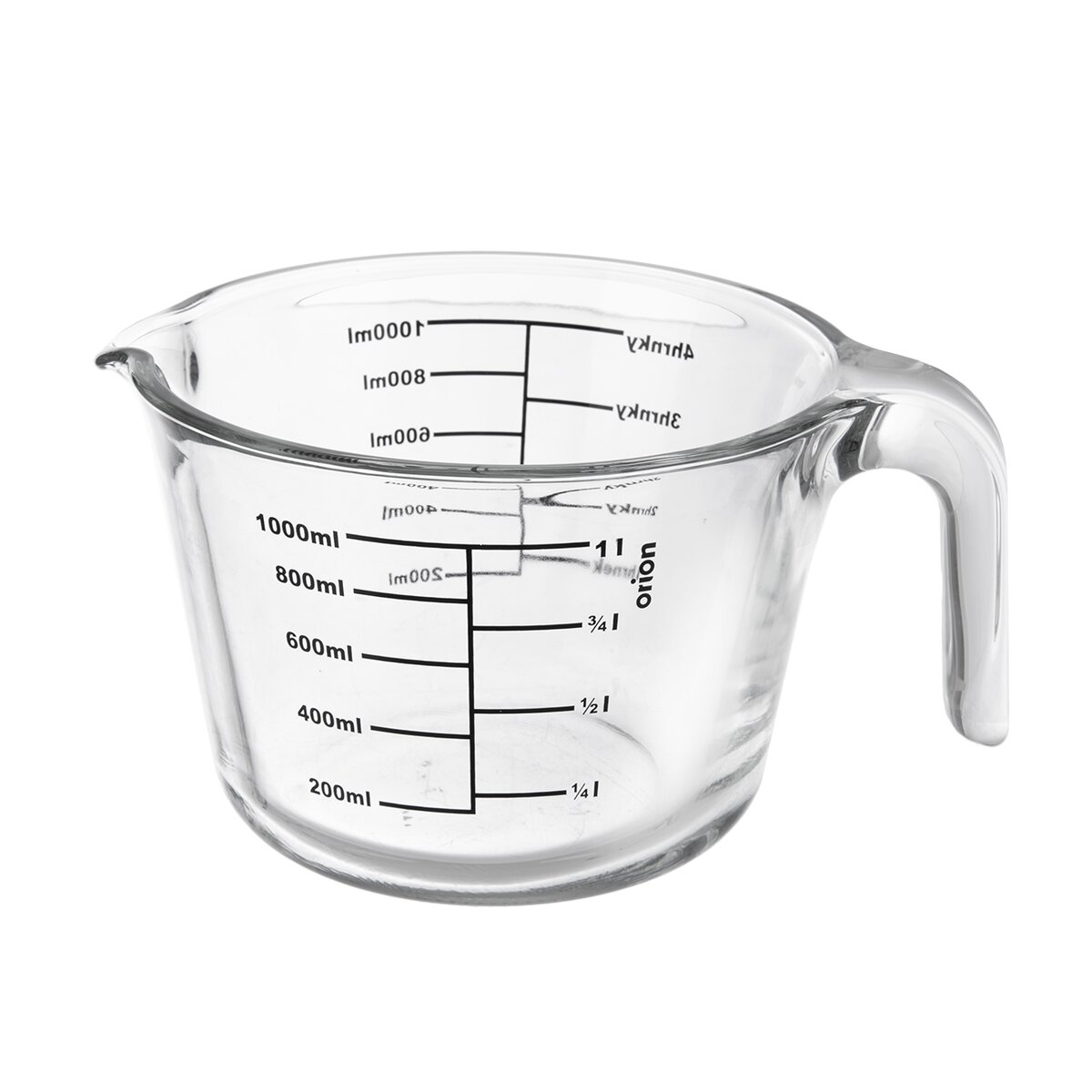 Kód produktu 120563Masívna sklenená odmerka s držadlom a výlevkou je potlačená stupnicami pre pohodlné meranie objemov. Na nich sú vyznačené miery pre 1000 ml a 4 hrnčeky pri použití hrnčekových receptov.