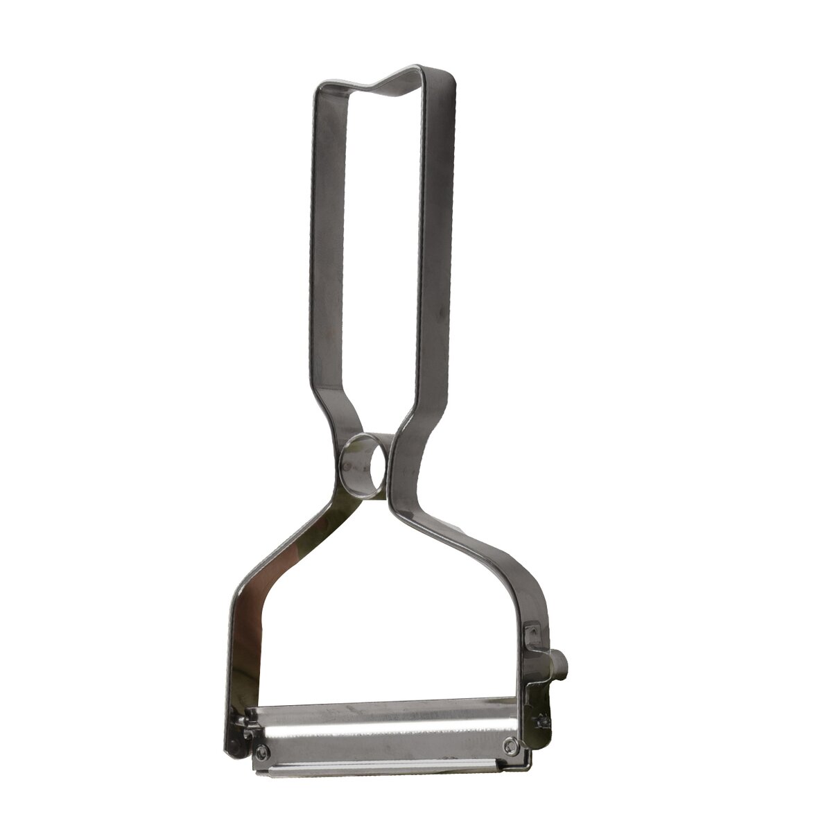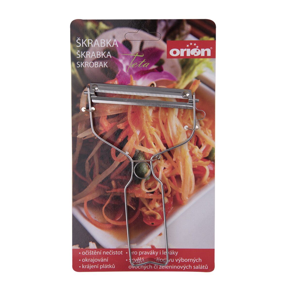 Celokovová škrabka so zubatým ostrím ľahko oškrabe a nakrája zeleninu či ovocie na tenké plátky. Vďaka svojej šírke sa skvele hodí na krájanie kapusty, cukety a zemiakov. Sklon ostria je zámerný a zlepšuje funkčnosť. Uško na strane slúži na odstránenie kazov plodov, tiež ho možno použiť na zdobenie citrusov a na uľahčenie odstraňovania kôry. Materiál: nerez. Rozmery: š. 10 cm, d. 17 cm.