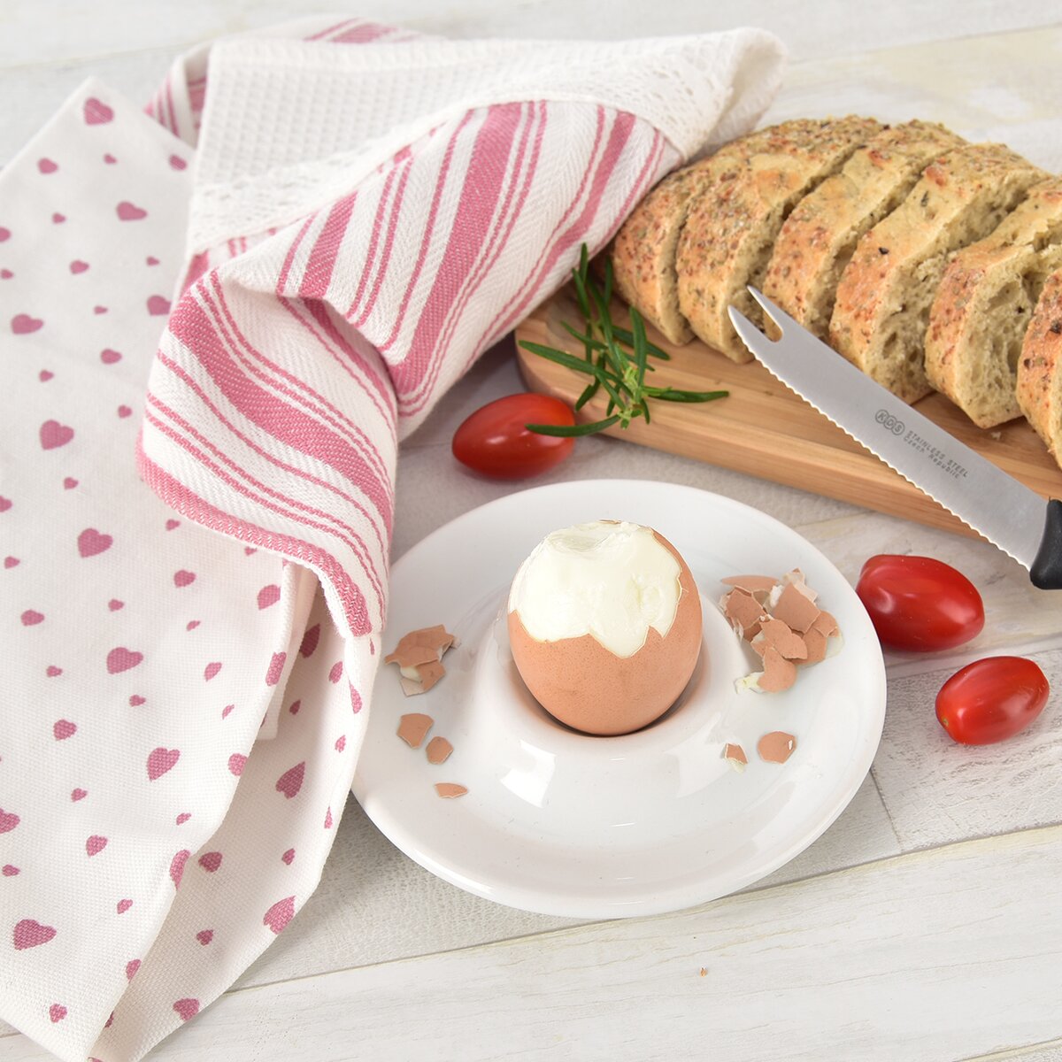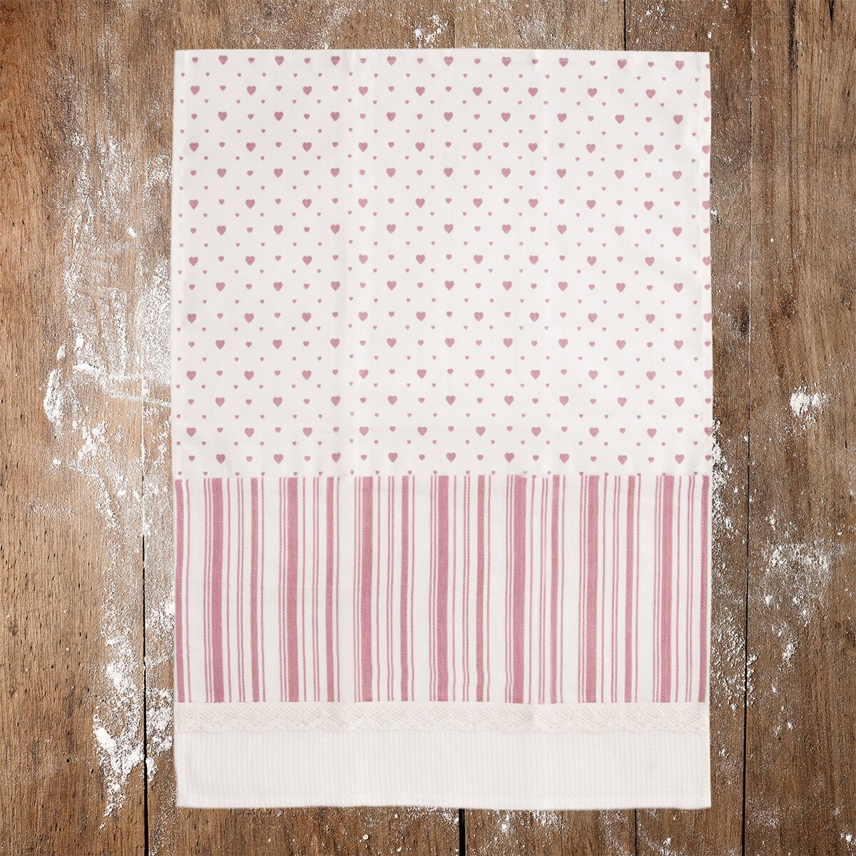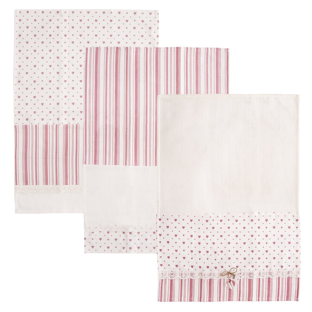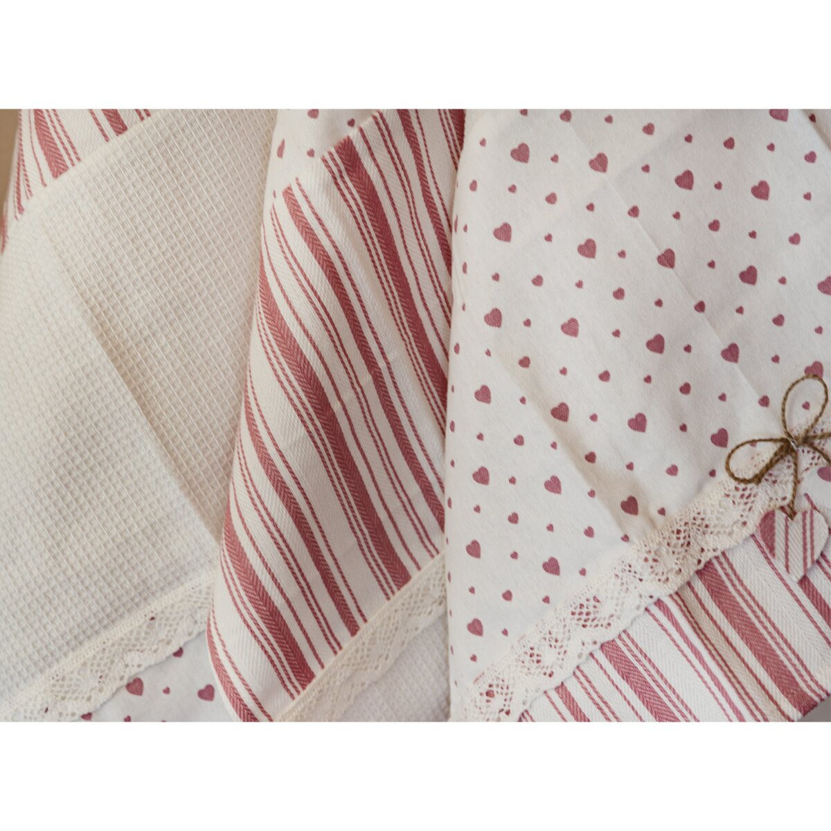 Spojenie prúžkov so vzorom drobných srdiečok sa hodí nielen na chaty alebo chalupy, ale aj do modernej kuchyne. Všetky utierky sú navyše vybavené pútkami na zavesenie.