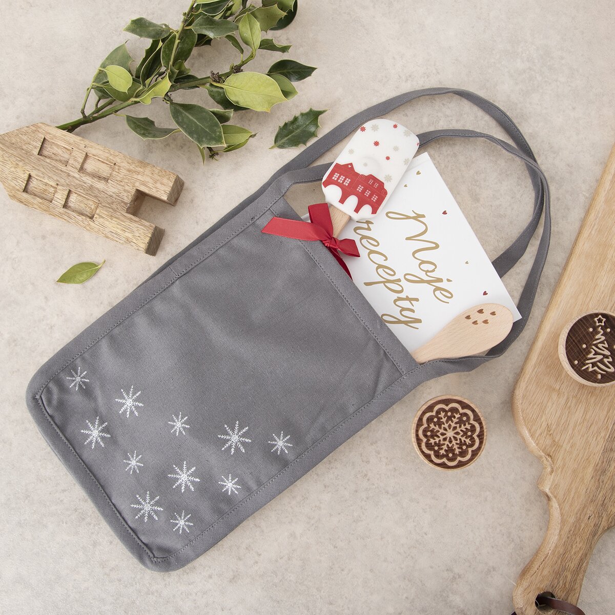Kód produktu 710993Štýlová sada 2 šedých utierok v rozmere 70x50 cm a tašky s dekorom bielych vločiek je vyrobená zo 100% bavlny. Slúži ako pekný darček a potom aj ako praktický pomocník nielen v kuchyni.