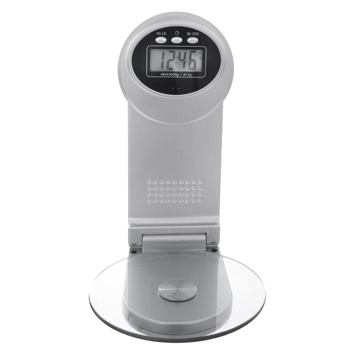 Kód produktu 131803Kuchynská závesná digitálna váha s LCD displejom a sklenenou výklopnou plochou, s možnosťou vážiť v g a oz. Obsahuje funkciu pre vynulovanie a dovažovanie, hodiny a časovač.