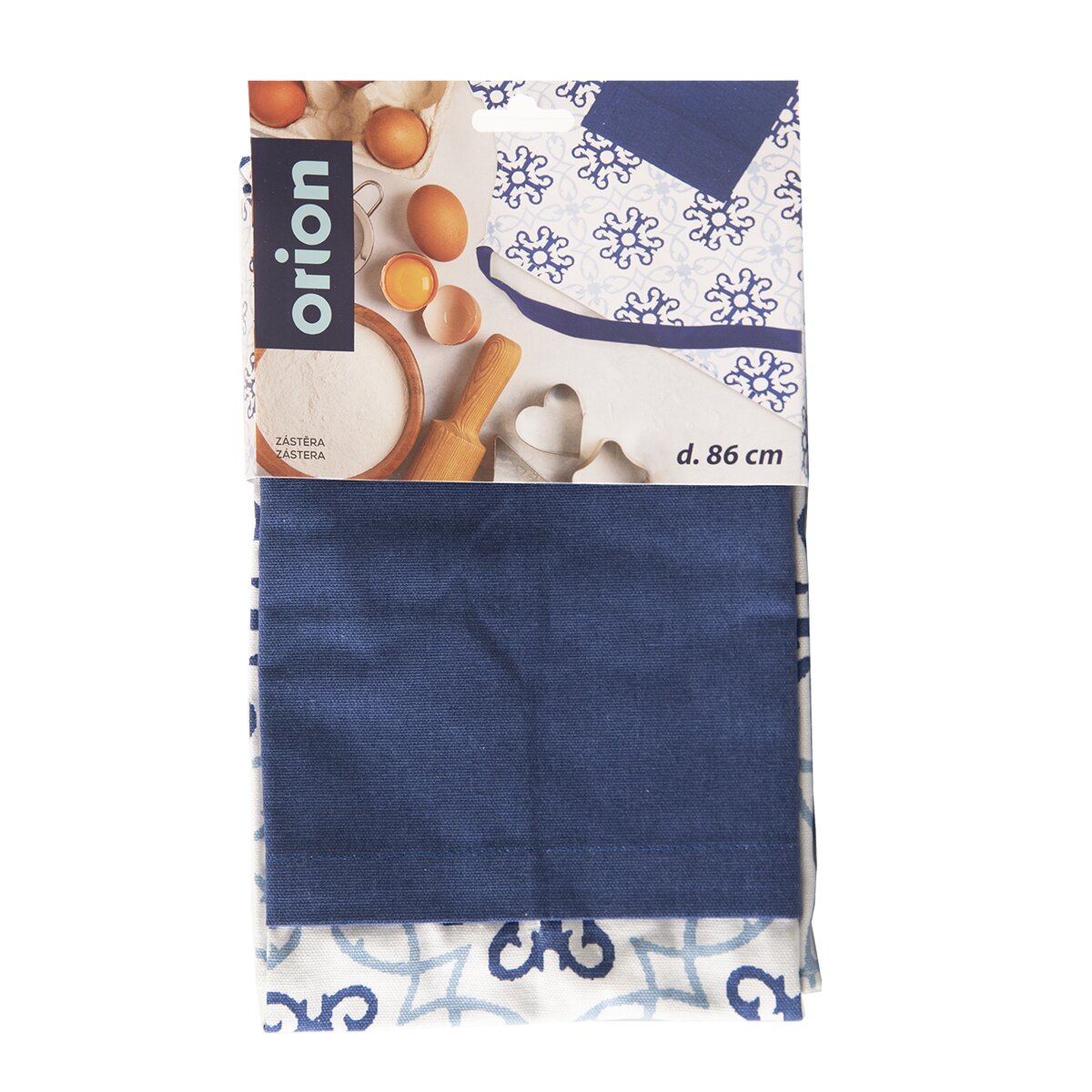 Kód produktu 960367Bavlnená kuchynská zástera s modrými ornamentami, s vreckom a nastaviteľným viazaním okolo krku.
