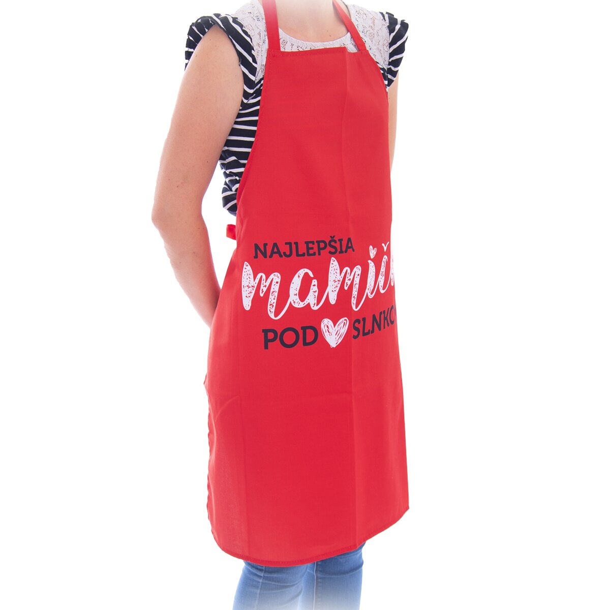 Kód produktu 960361Červená kuchynská zástera s nápisom Najlepšia mamička pod slnkom vyrobená zo 100% bavlny.