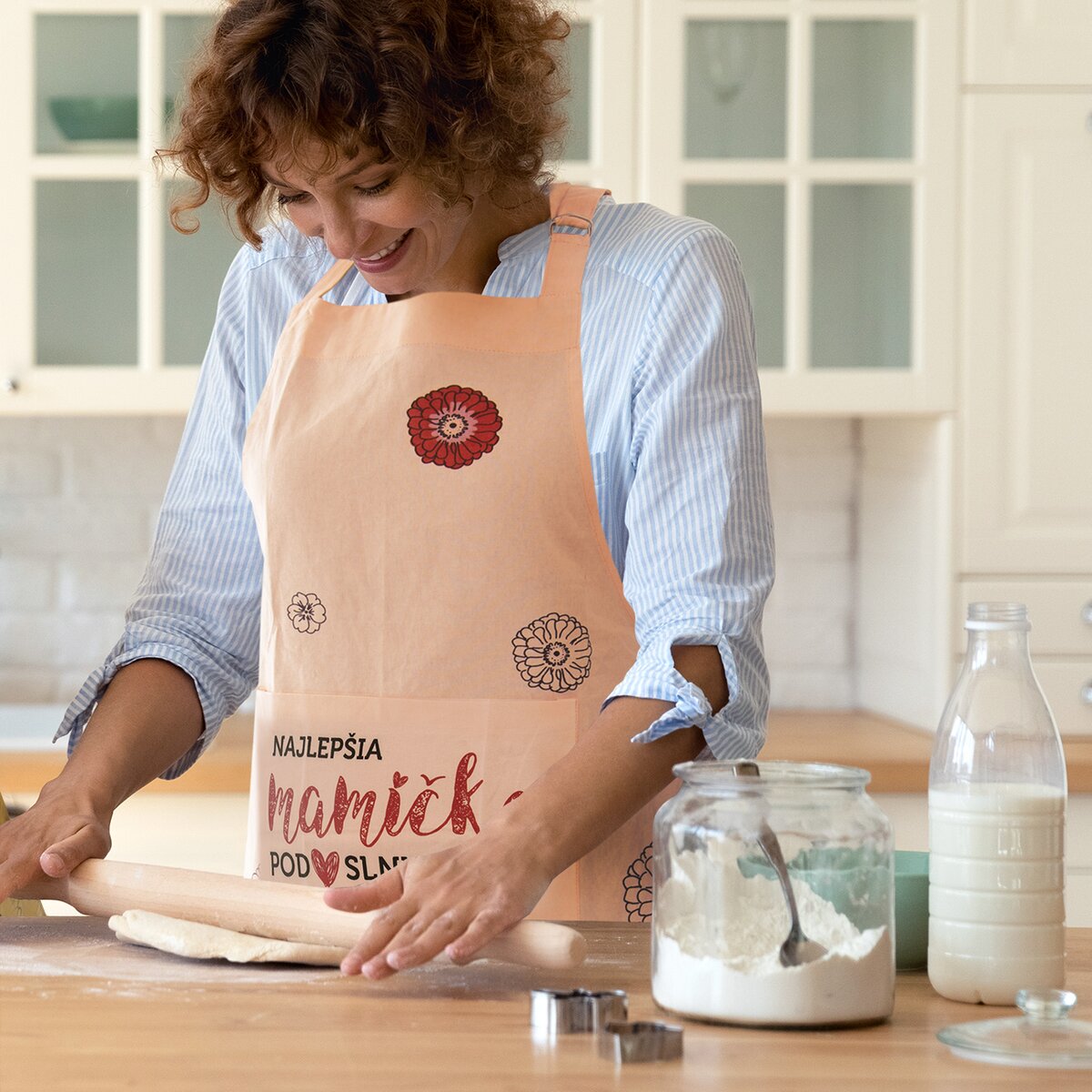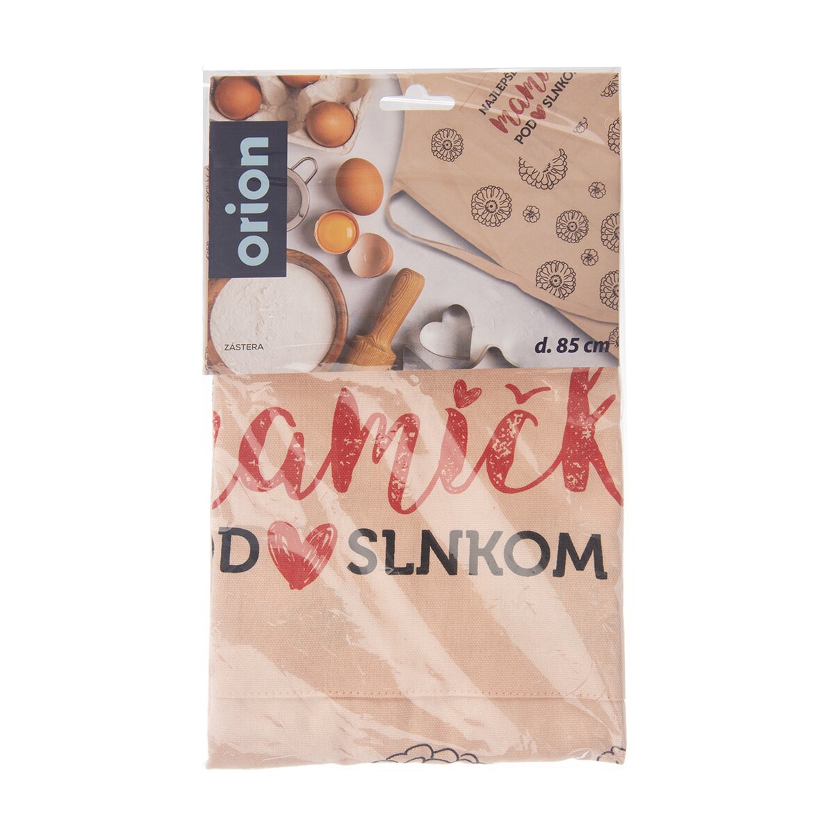 Kód produktu 960865Bavlnená zástera v marhuľovej farbe, s kvetinovou potlačou a nápisom NAJLEPŠIA MAMIČKA POD SLNKOM. Má vrecko a nastaviteľné viazanie okolo krku.