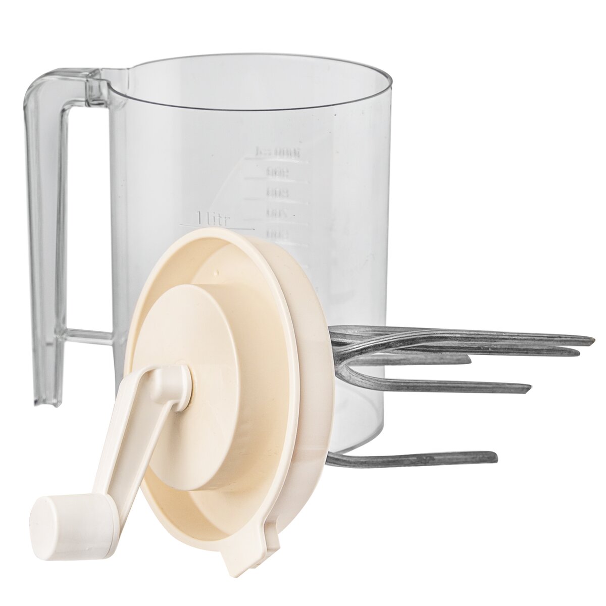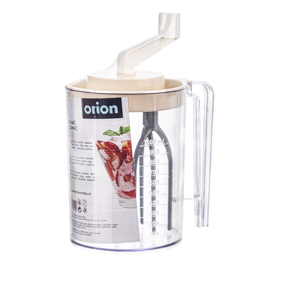 Kód produktu 130602Ručný kuchynský šľahač z plastu s objemom 1,5 l, s mernou stupnicou až do 1000 ml a metlami na šľahanie z eloxovaného hliníka.