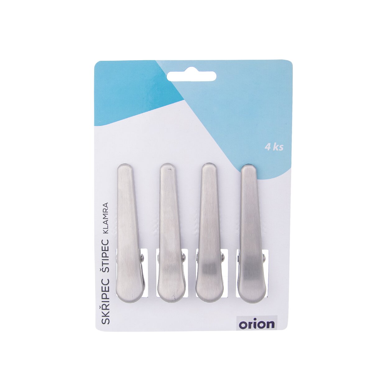 Štipec - klip na pevné uzatvorenie vreciek - potraviny v nich neosýchajú, nepreberajú pachy a chute z iných uložených potravín, nerozsypú sa. Sada 4 kusov, Materiál: nerez. Rozmery: d. 8 cm.