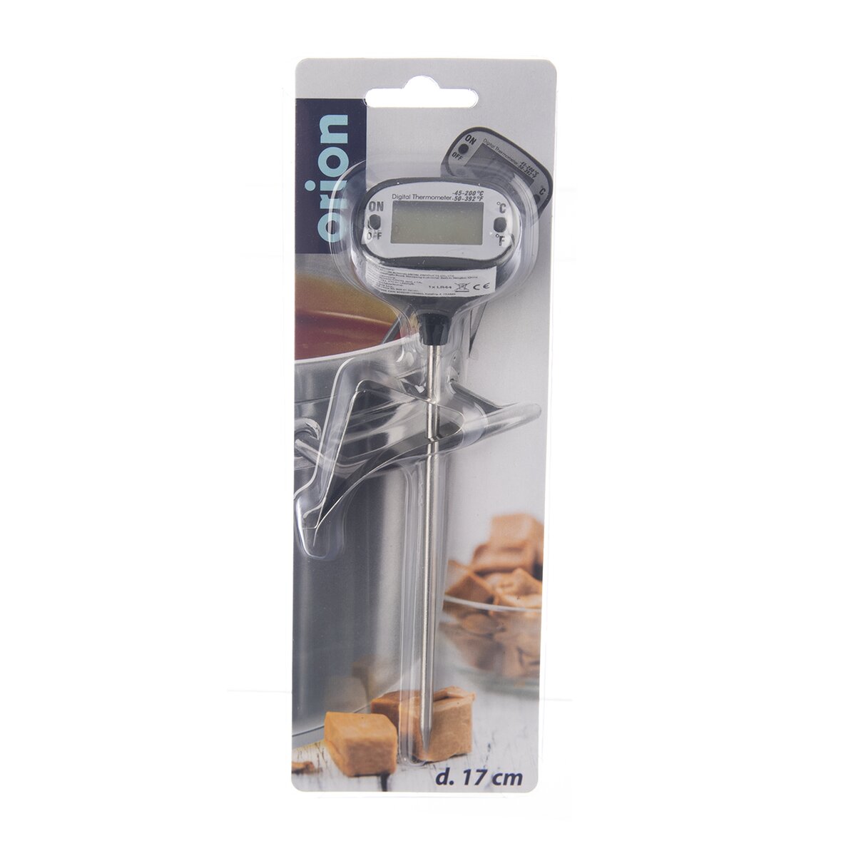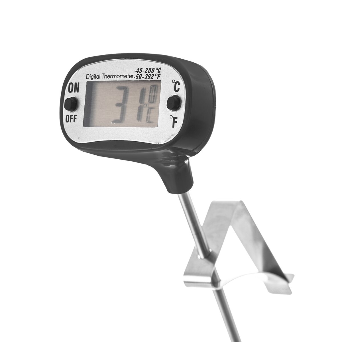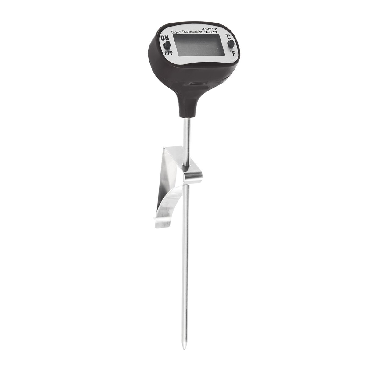 Meria po zapnutí tlačidla ON/OFF v stupňoch Celzia či Fahrenheita, a to od -45 °C do +200 °C, -50 °F do +392 °F. Teplomer potom stačí rovnakým silikónovým tlačidlom vypnúť alebo sa po cca 10 minútach nečinnosti sám vypne. Slúži iba na zmeranie aktuálnej teploty, nevkladajte ho do rúry. Hlavica je vyrobená z plastu (ABS), hrot je nerezu (s/s 304) a spona z kovu. Napájanie na 1x LR44 (nie je súčasťou výrobku).
