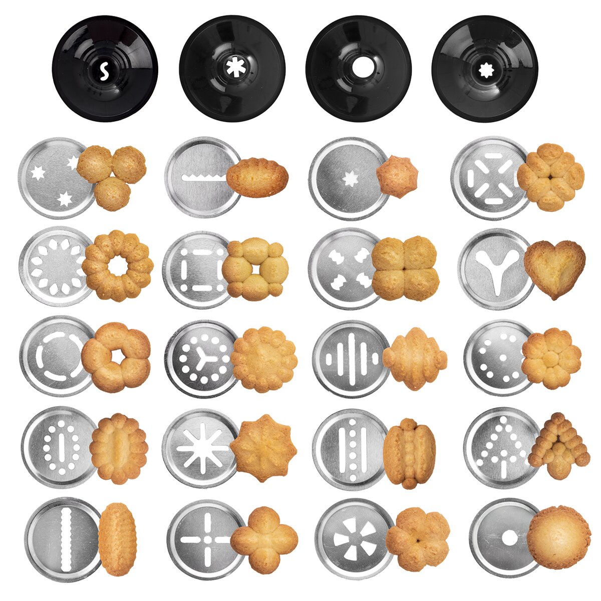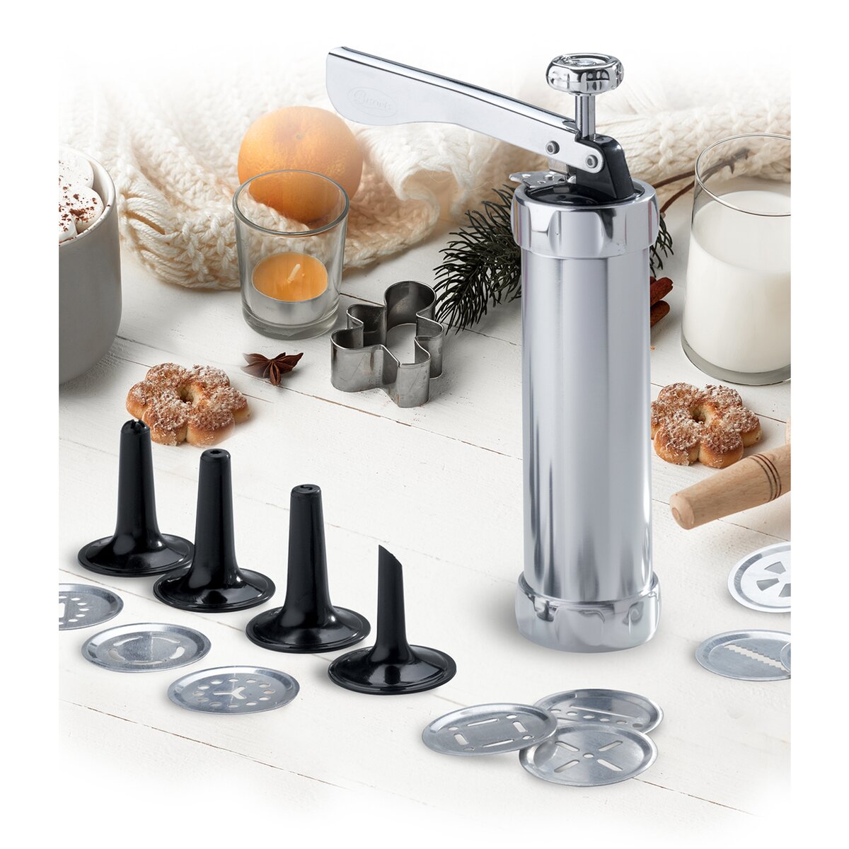 Kód produktu 141743Kovový mechanický lis na prípravu krehkých maslových sušienok. Jeho súčasťou je aj 20 ks nástavcov na rôzne tvary sušienok a 4 plastové zdobiace nástavce na zdobenie tort, dezertov i chlebíčkov.