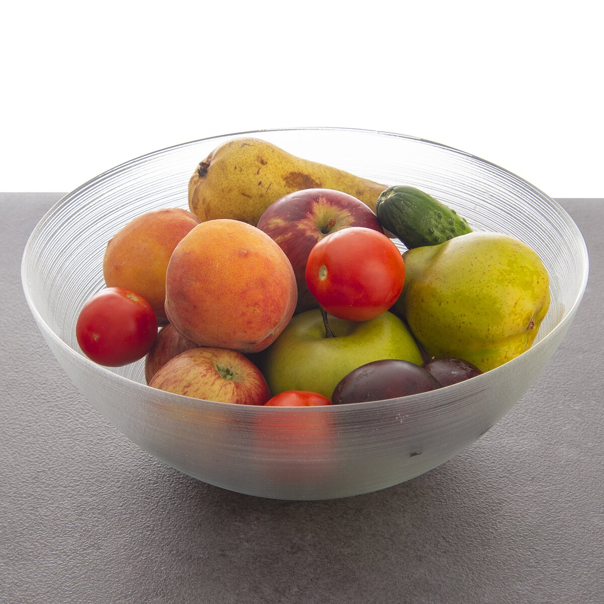 Kód produktu 129816Dizajnová sklenená miska s priemerom 28 cm je zdobená z vonkajšej strany jemným plastickým dekórom prúžkov.
