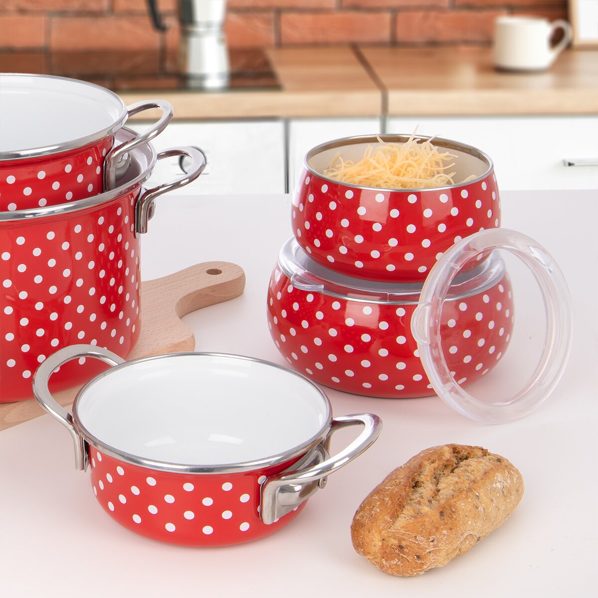 Kód produktu 129236Smaltovaná miska BODKA s objemom 1,1 l, s nerezovým lemom a plastovým viečkom, má univerzálne použitie, je vhodná na skladovanie, servírovanie aj prenášanie potravín, hotových jedál.