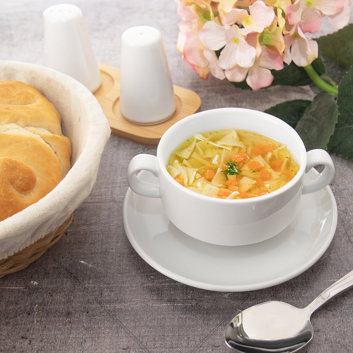 Kód produktu 129842Porcelánová polievková miska s objemom 310 ml, doplnená dvoma uchami, je určená na podávanie horúcich polievok, ale aj zdravých raňajok a desiaty s müsli, ovocia, jogurtu i zeleninových šalátov.