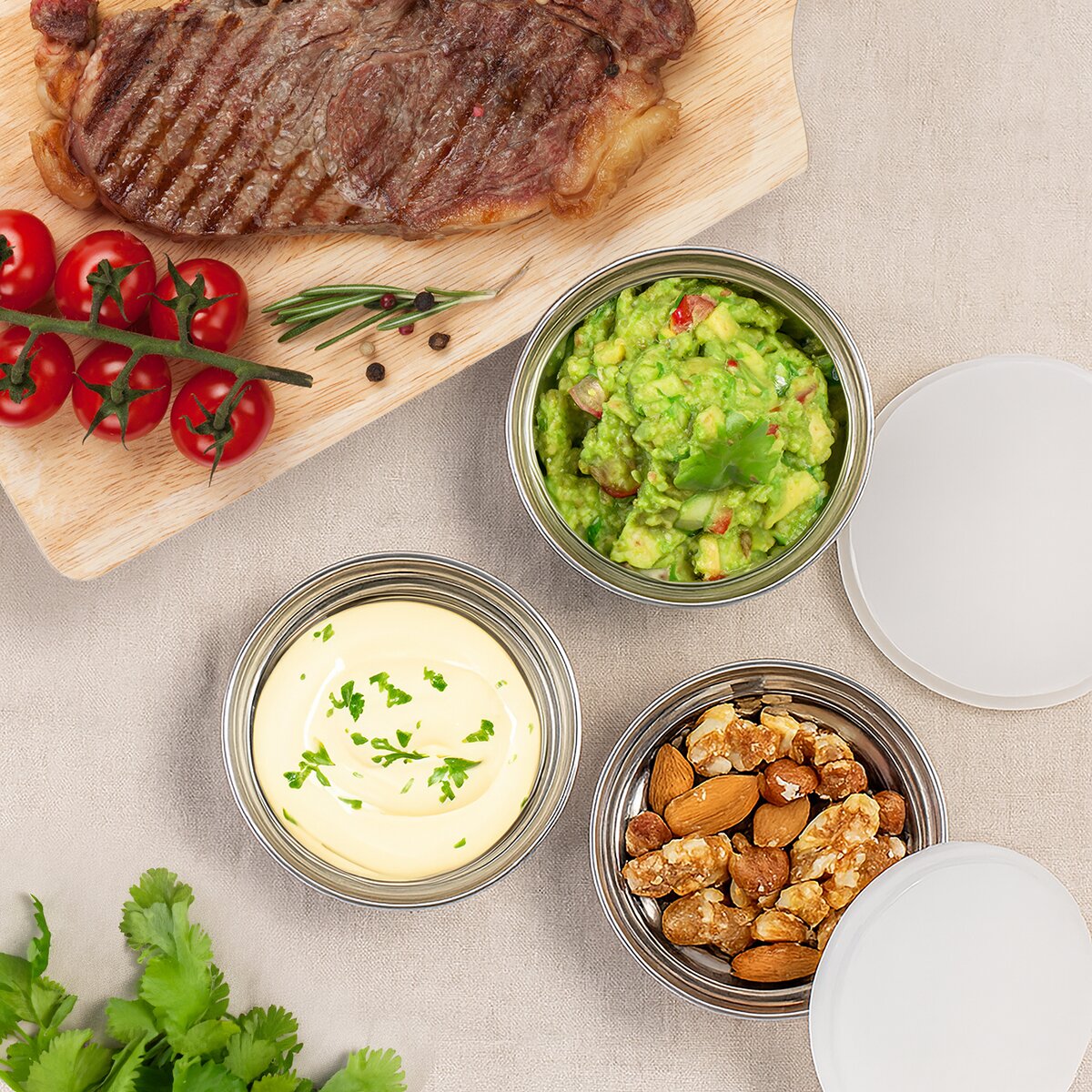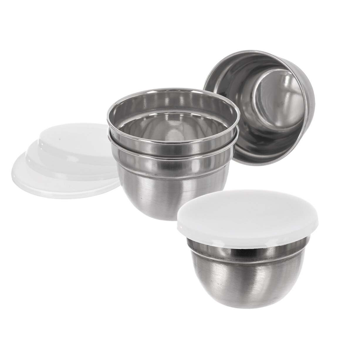 Kód produktu 129269Sada nerezových mištičiek je ideálna na omáčky a dipy – skvele sa hodí na grilovanie alebo na večer s priateľmi. Vďaka praktickému viečku je možné mištičku uzavrieť a pohodlne uložiť do chladničky bez obáv z vyliatia. Mištičky je možné umývať v umývačke riadu, nie sú však vhodné do mikrovlnnej rúry. Balenie obsahuje štyri kusy mištičiek s viečkom. Materiál: nerezová oceľ, plast PE. Rozmery: mištička - o. 0,2 l, pr. 8 cm, v. 5,5 cm, viečko - pr. 8,5 cm, v. 0,5 cm.