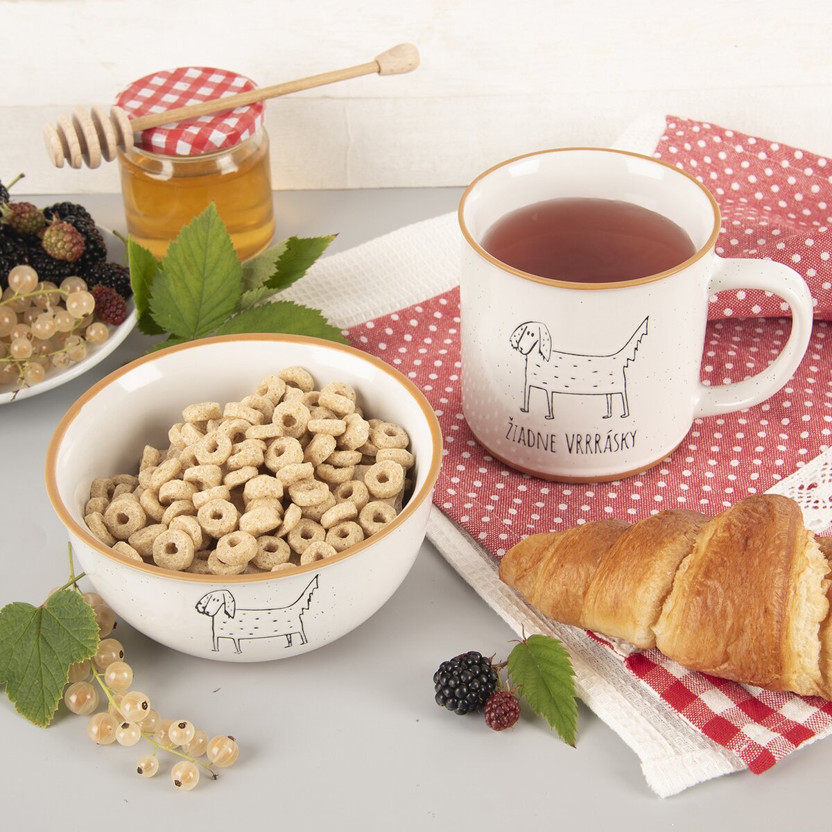 Kód produktu 129217Keramickú misku s objemom 0,55 l zdobí motív psa a zo zadnej strany originálny nápis s vtipom "Žiadne VRRRásky". Je ideálna na prípravu raňajok, podávanie polievky aj večerných chuťoviek k vínu či pivu.