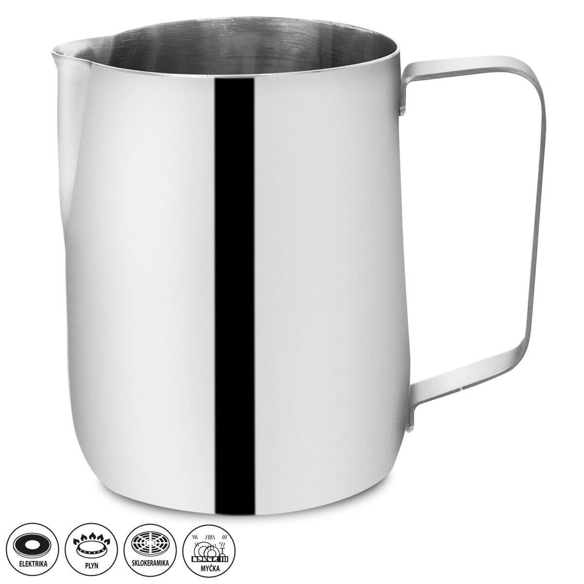 Hrnček na mlieko nerezový s výlevkou v matnom prevedení z nerezu. Možnosť použitia na elektrickom, plynovom sporáku, sklokeramickej. Nie na indukciu. Objem 0,8 l, v. 12,5 cm.