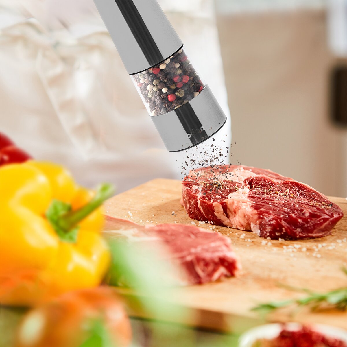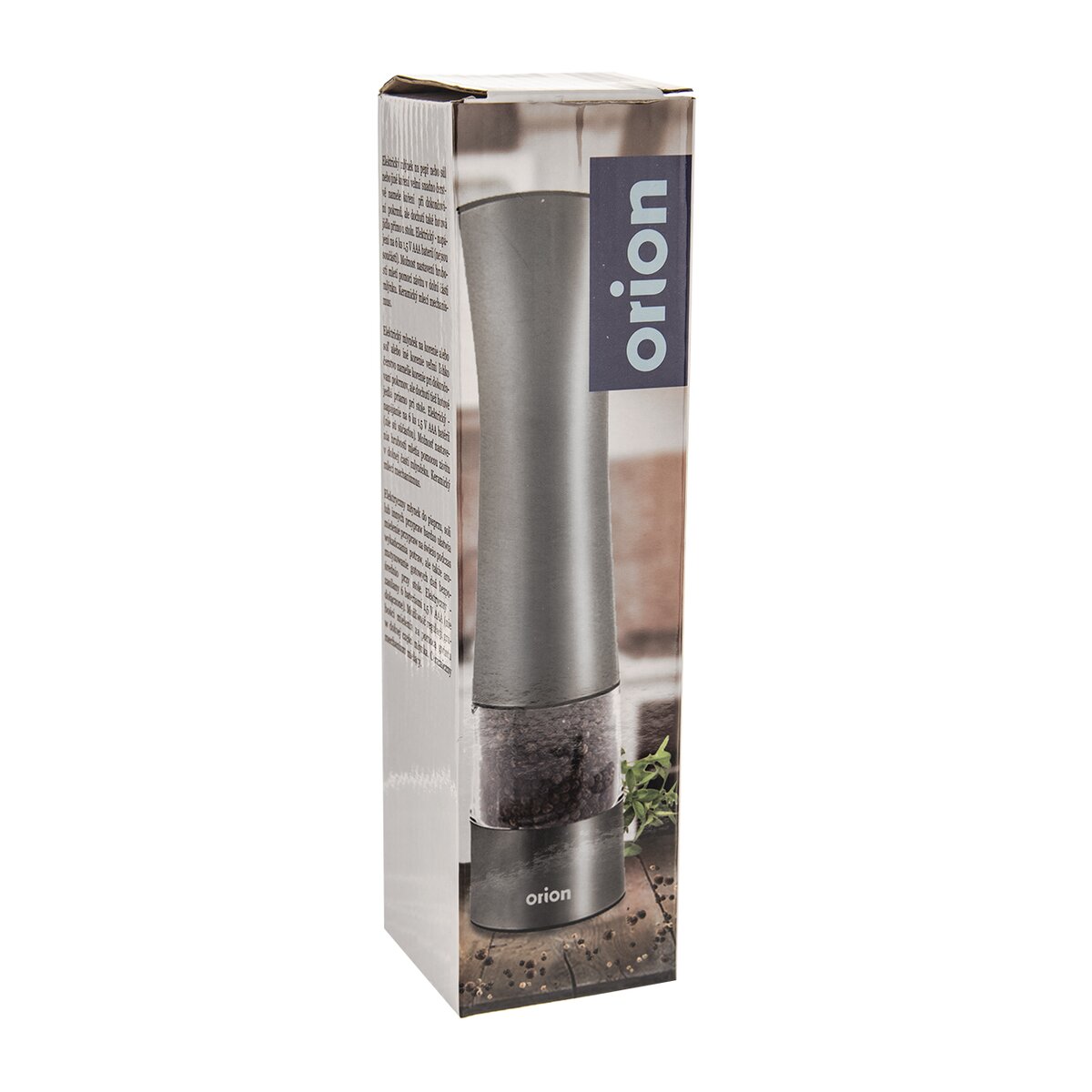 Viac informáciíLuxusne vyzerajúci elektrický nerezový mlynček na korenie alebo soľ ergonomického tvaru, ktorý ľahko čerstvo namelie korenie pri dokončovaní pokrmov, ale dochutí aj hotové jedlá priamo pri stole. Stačí len stlačiť tlačidlo v jeho hornej časti. Zostávajúce množstvo korenie možno sledovať vďaka transparentnej časti zásobníka z plexiskla.