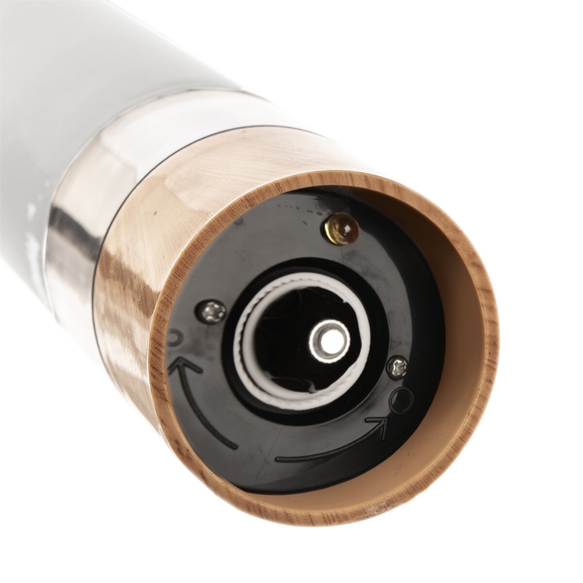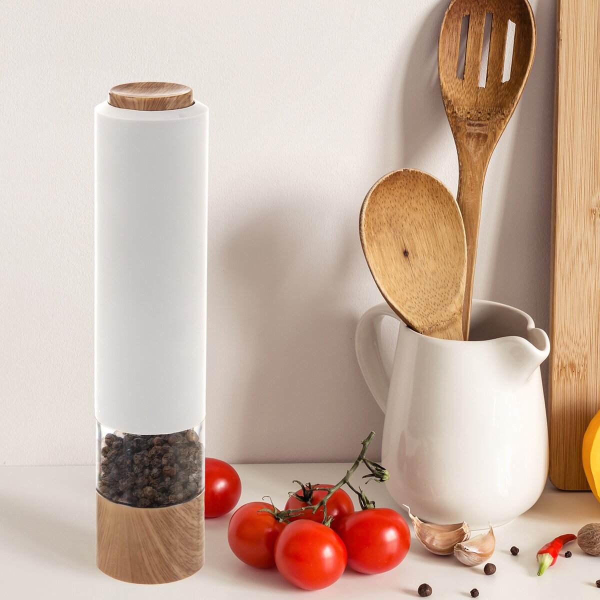 Kód produktu 130232Elegantný elektrický mlynček na korenie v kombinácii bielej farby a plastových prvkov v imitácii dreva. Je napájaný 1,5 V AA batériami a určený na dochutenie pokrmov soľou, čiernym korením alebo iným korením. Má keramický mlecí mechanizmus a LED osvetlenie.