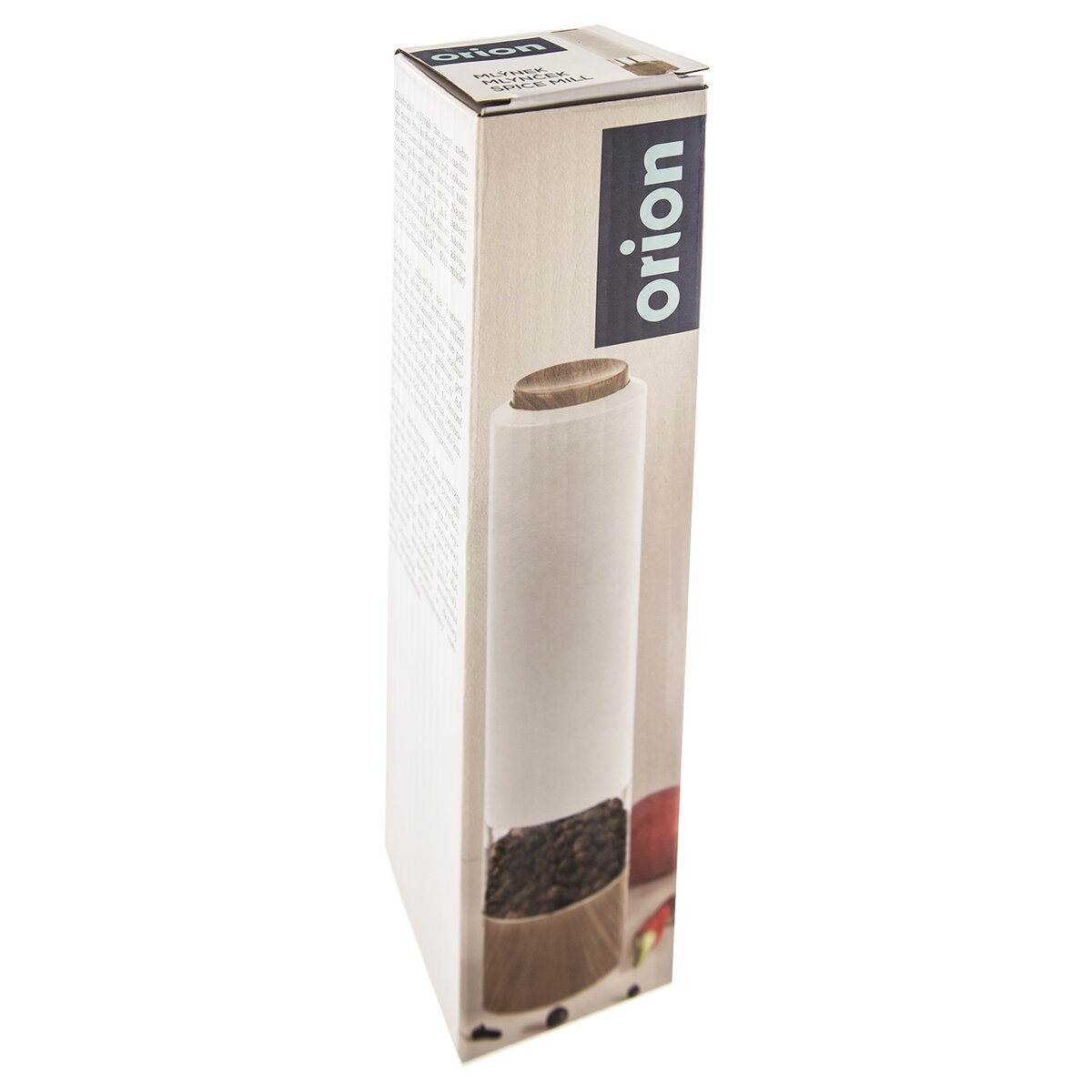 Viac informáciíElektrický mlynček na korenie alebo soľ rýchlo namelie korenie pri dokončovaní pokrmov, ale dochutí aj hotové jedlá priamo pri stole. Stačí len stlačiť tlačidlo v jeho hornej časti. Množstvo korenia môžete vizuálne skontrolovať vďaka transparentnej časti z plastu. Kombinuje bielu farbu s dolnou časťou a tlačidlom v imitácii dreva. Má integrované LED osvetlenie.