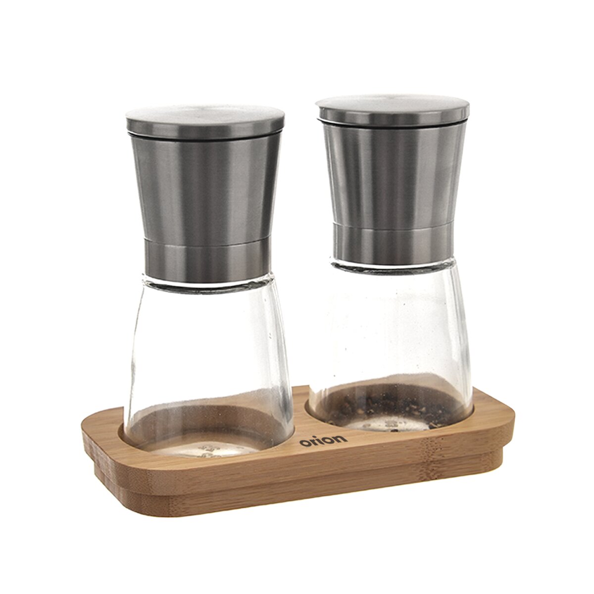 Kód produktu 130228Mechanické mlynčeky na korenie a soľ z nerezu a skla, opatrené keramickým mlecím mechanizmom, pre rýchle dochucovanie pokrmov pri varení aj pri servírovaní. Uložené na bambusovom podnose.