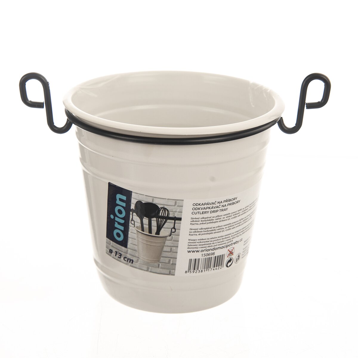 Závesný odkvapkávač na príbory umiestite pomocou háčikov na závesný kuchynský systém. Môžete ho využiť tiež na odloženie kuchynského náčinia, na uloženie kvetináča s bylinkami, ako nádobu pre uchovane rezaných byliniek... Materiál: kov. Rozmery: pr. 13 cm, v. 12,5 cm. Odporúčame opatriť háčiky z našej ponuky 834724, ak potrebujete závesnú tyč, využite naše ponuku pod číslom 530878.