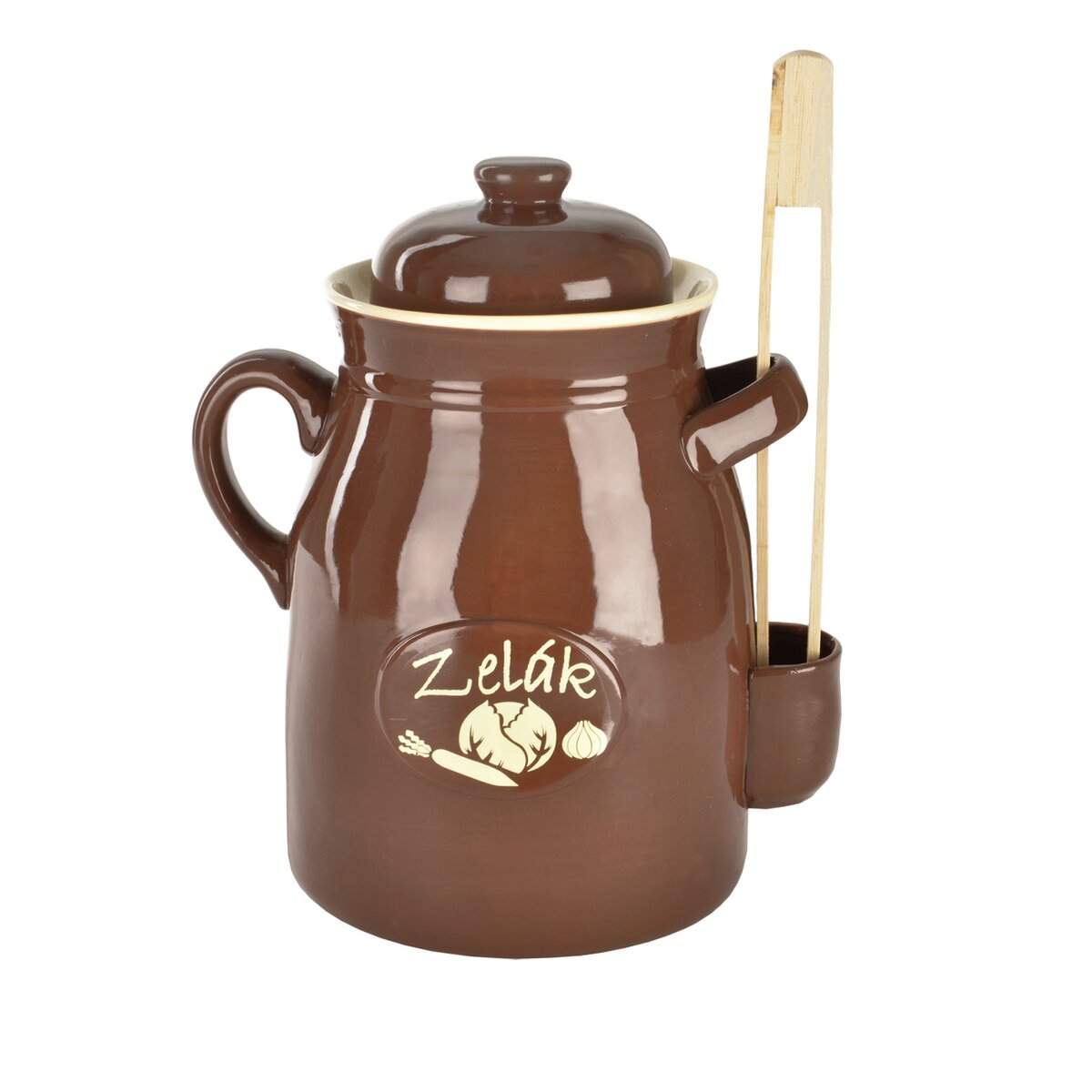 Kód produktu 111685Hrniec kyseláč nájde všestranné uplatnenie vo Vašej kuchyni. Slúži najmä na prípravu doma nakladaných pokrmov, ako sú kvašaky, utopenci, ryby, syry a ďalšie lahôdky nakladané do oleja alebo octového nálevu. Hrniec je vyrobený z úžitkovej glazovanej keramiky, ktorá neprepúšťa svetlo, udržuje stálu teplotu a potraviny potom získajú lepšie podmienky pre dozretie a správnu chuť. Súčasťou hrnca je keramická pokrievka a drevené kliešte na vyberanie uložených potravín. Hrniec má 2 bočné ucha a vrecko na zachytenie odkvapkávajúcej tekutiny z klieští. Navyše má žliabok, do ktorého nalejete vodu na zabezpečenie správneho procesu kvasenia. Rozmery: objem 6 l, pr. 20,5 cm, v 32 cm.