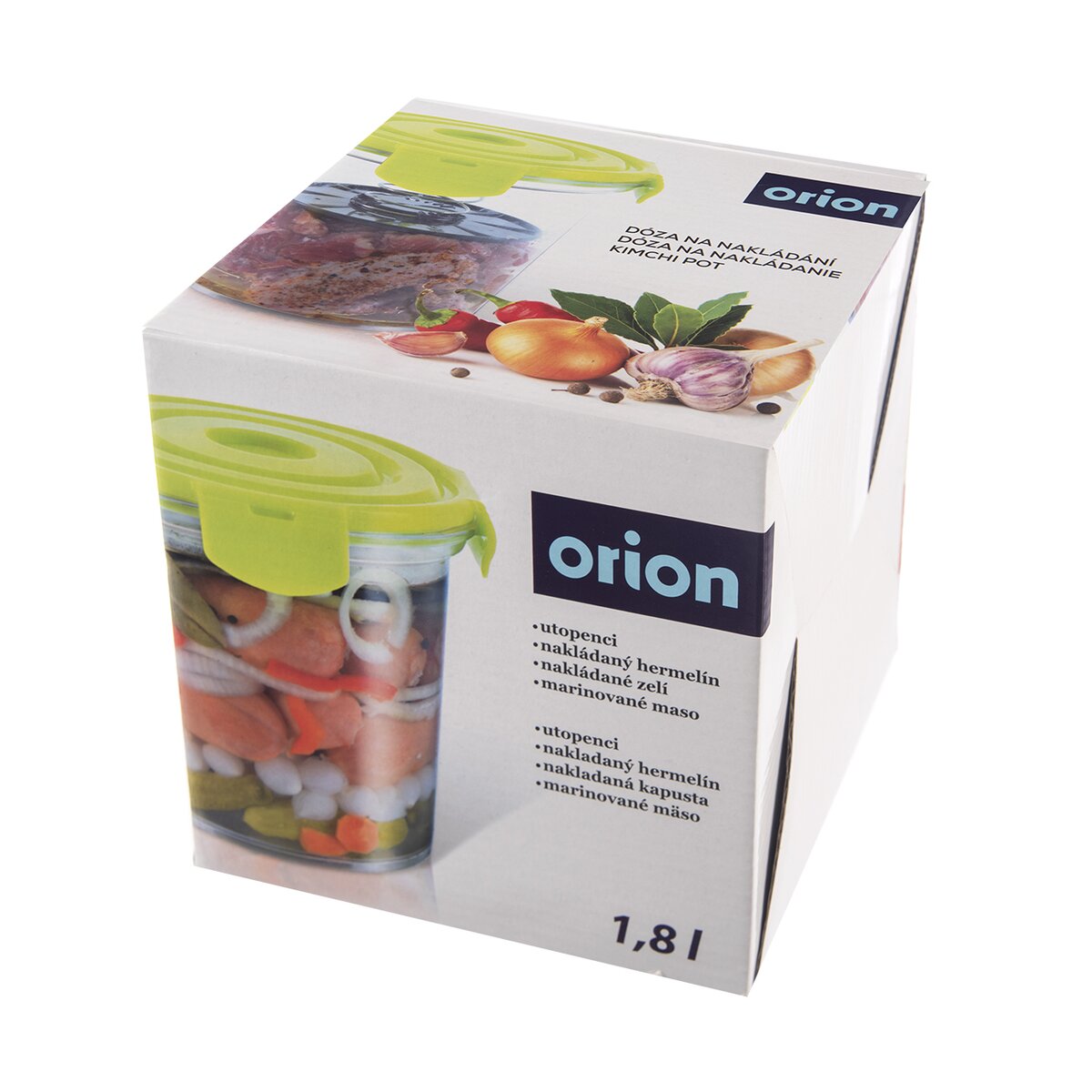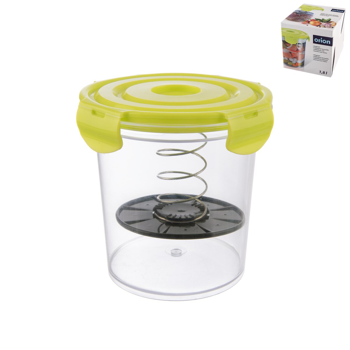 Má objem 1,8 l. Viečko s nerezovou pružinou umožňuje stlačenie potravín, čím znižuje spotrebu marinády alebo oleja a napomáha zvýrazniť ich chuť, najmä syry sa lepšie preležia a v oleji sa zakonzervujú do doby, kým bude ten správny čas na ich konzumáciu.